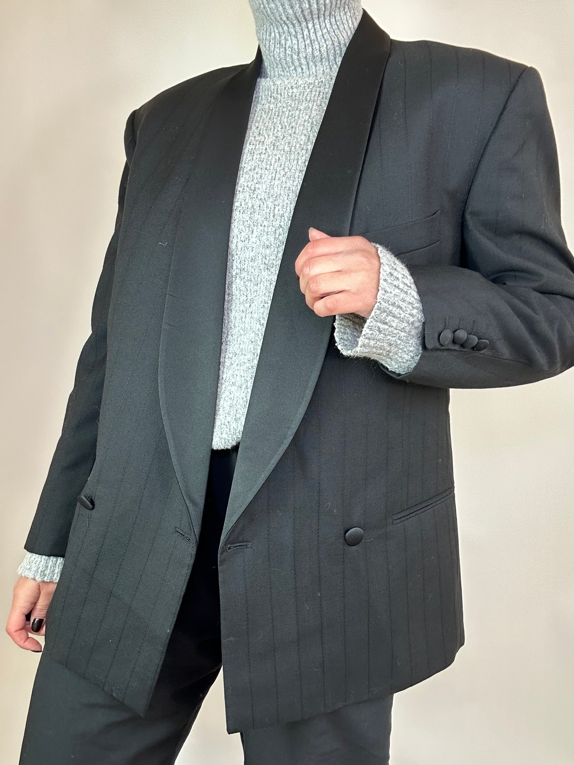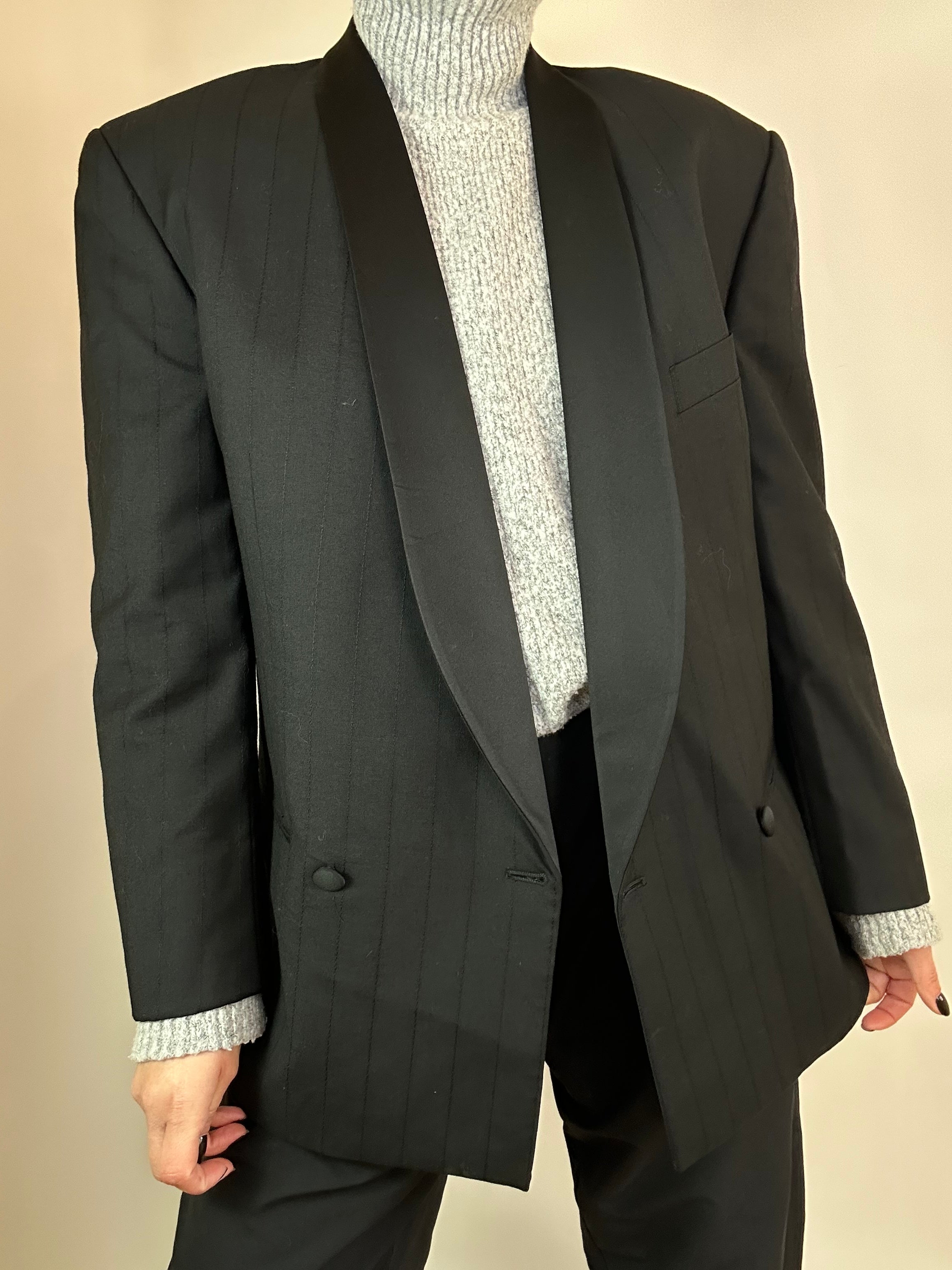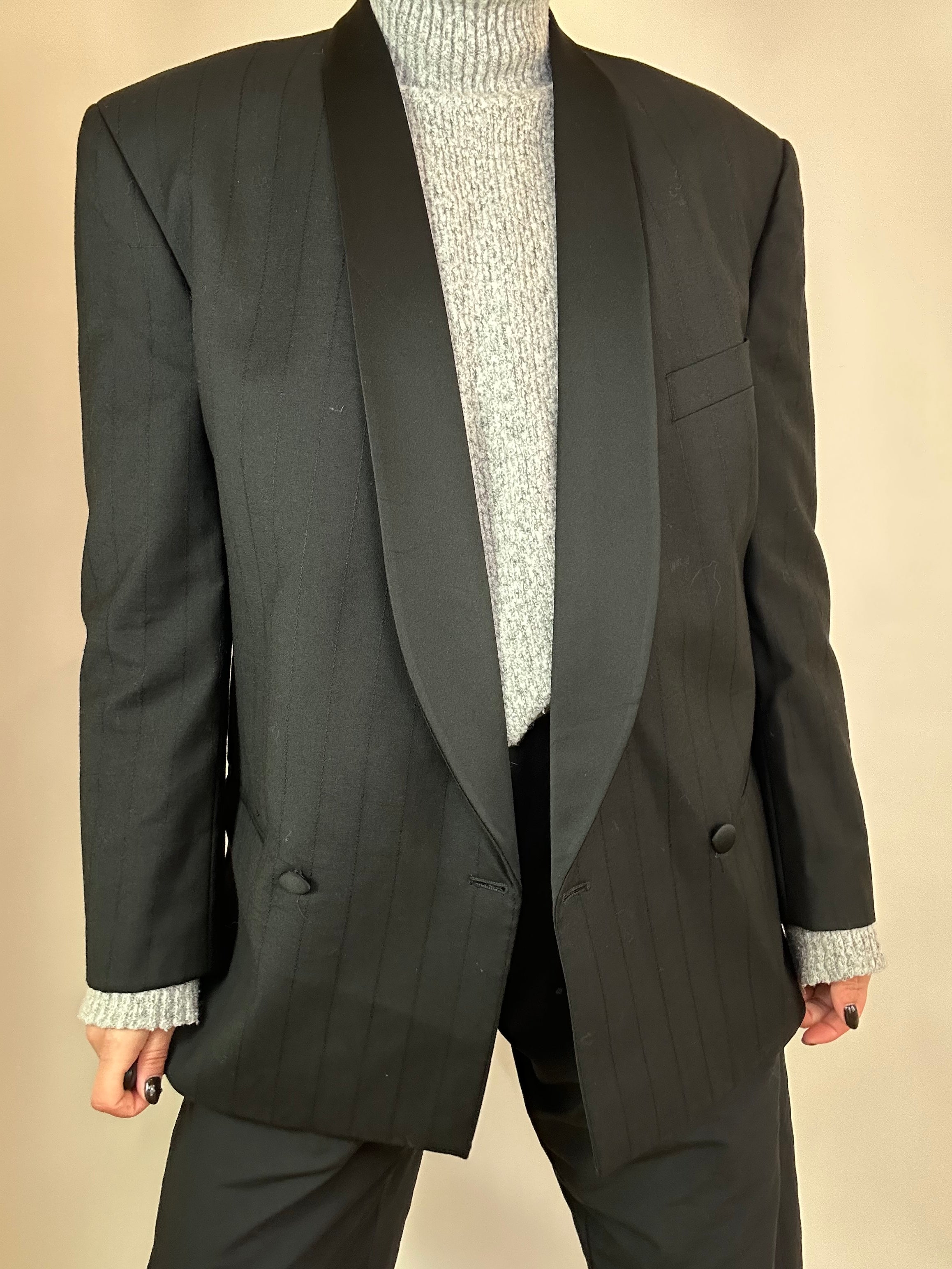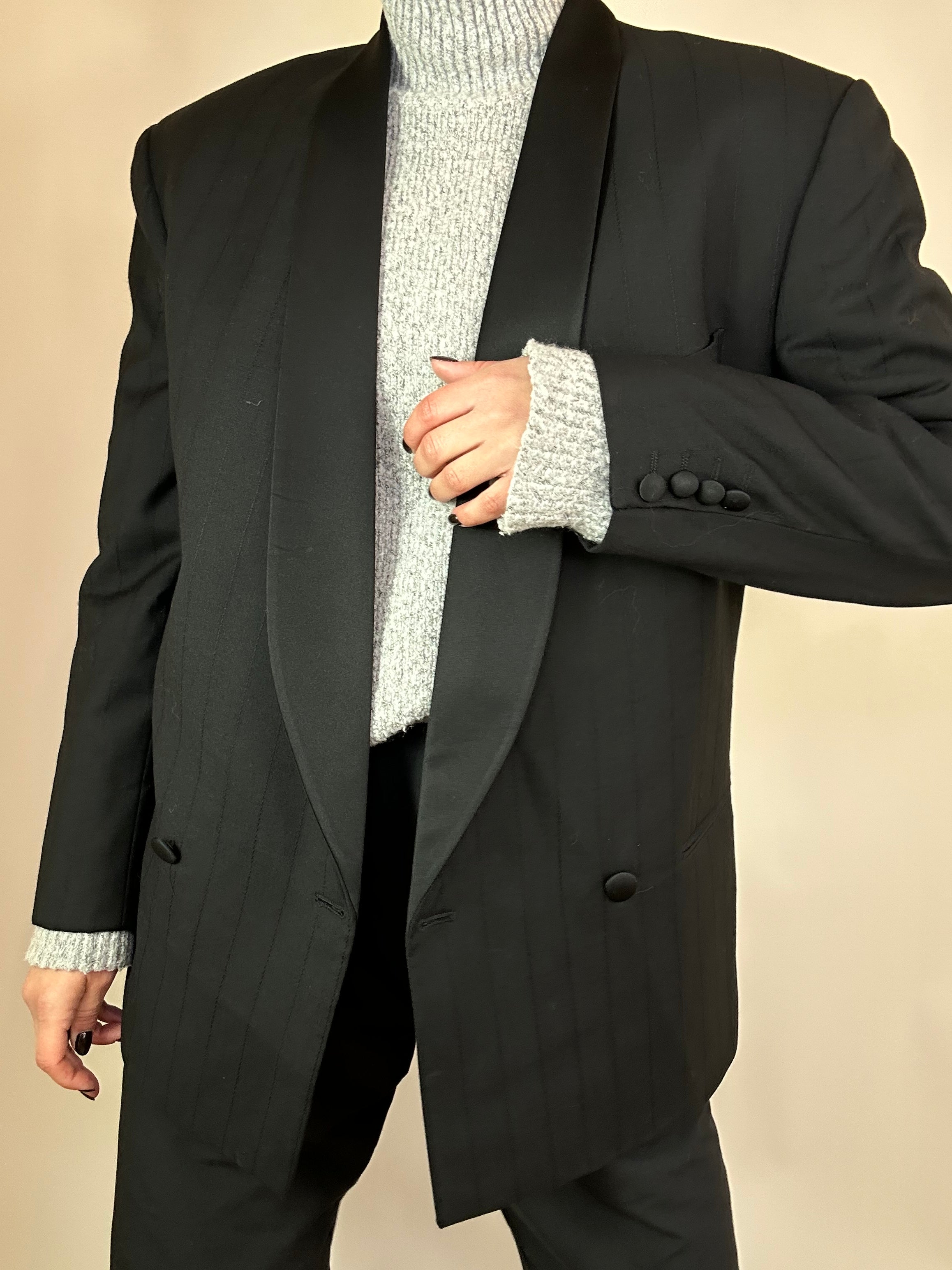 Blazer nero gessato taglia uomo 48 in pura lana vergine Vestibilità donna: 42-44 Misure capo: Spalla a spalla 50cm, Lunghezza 75cm Altezza modella: 1.65, taglia 42