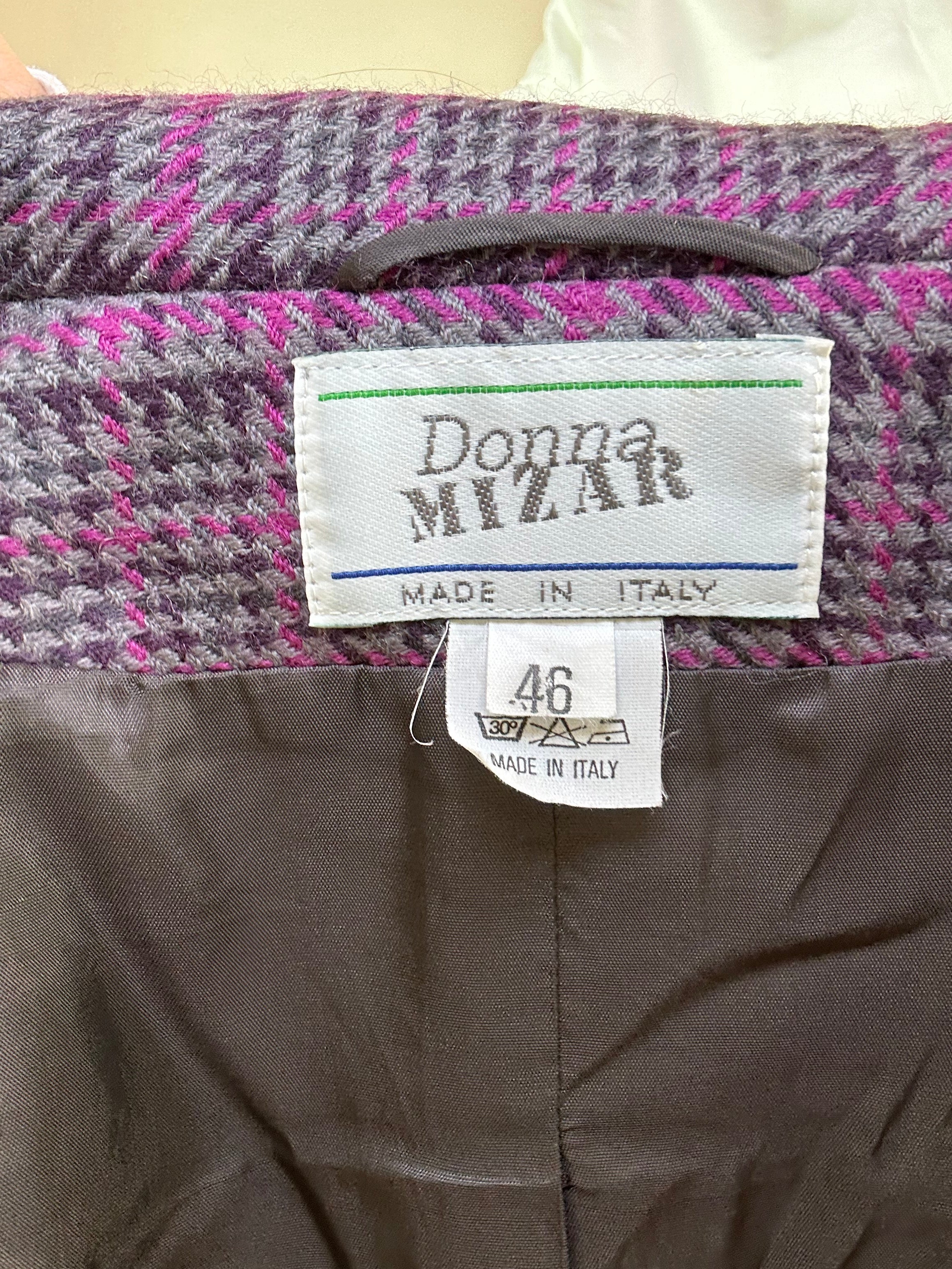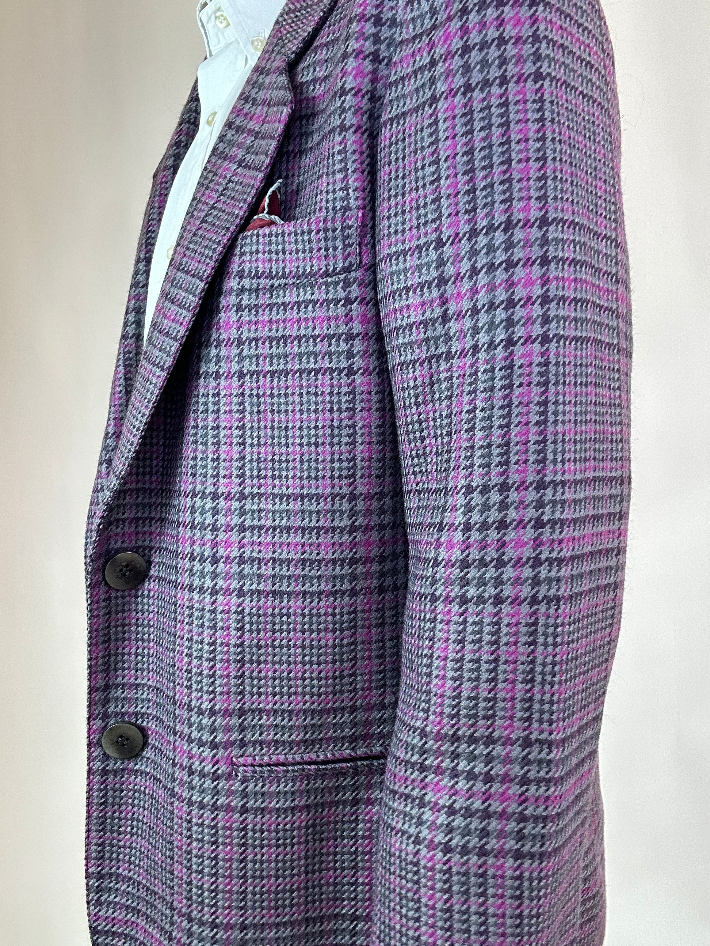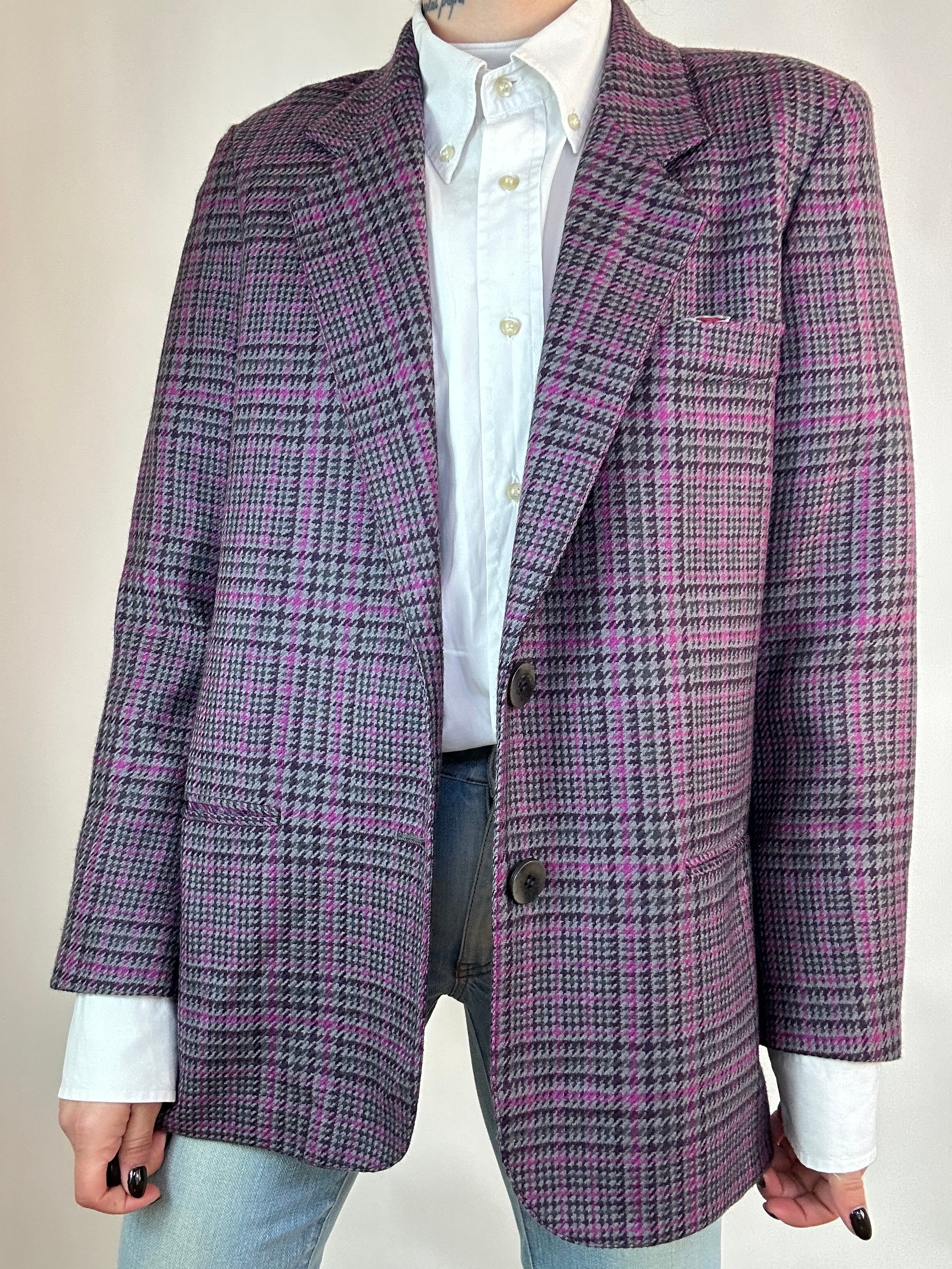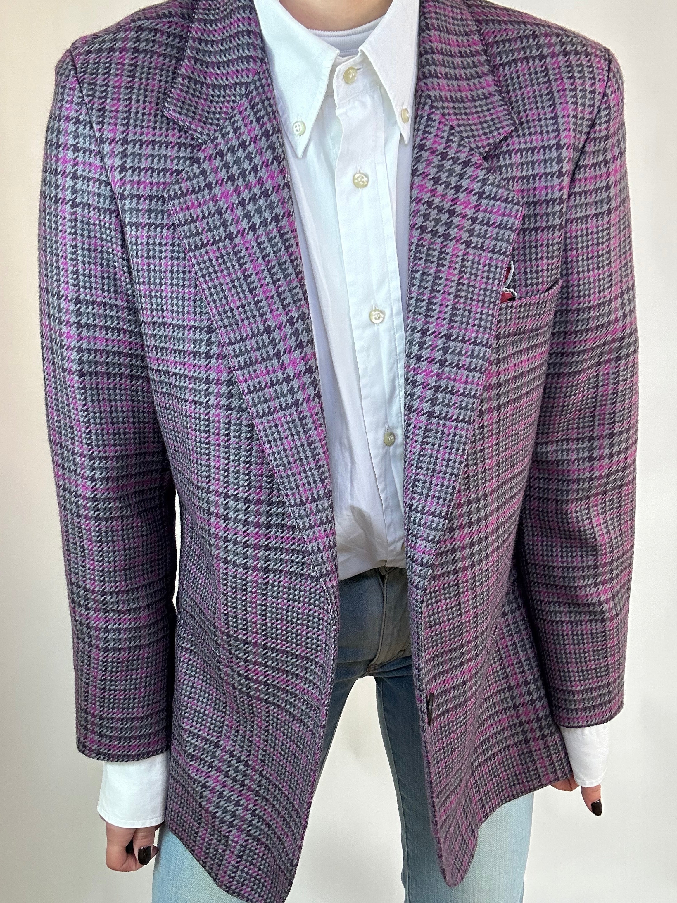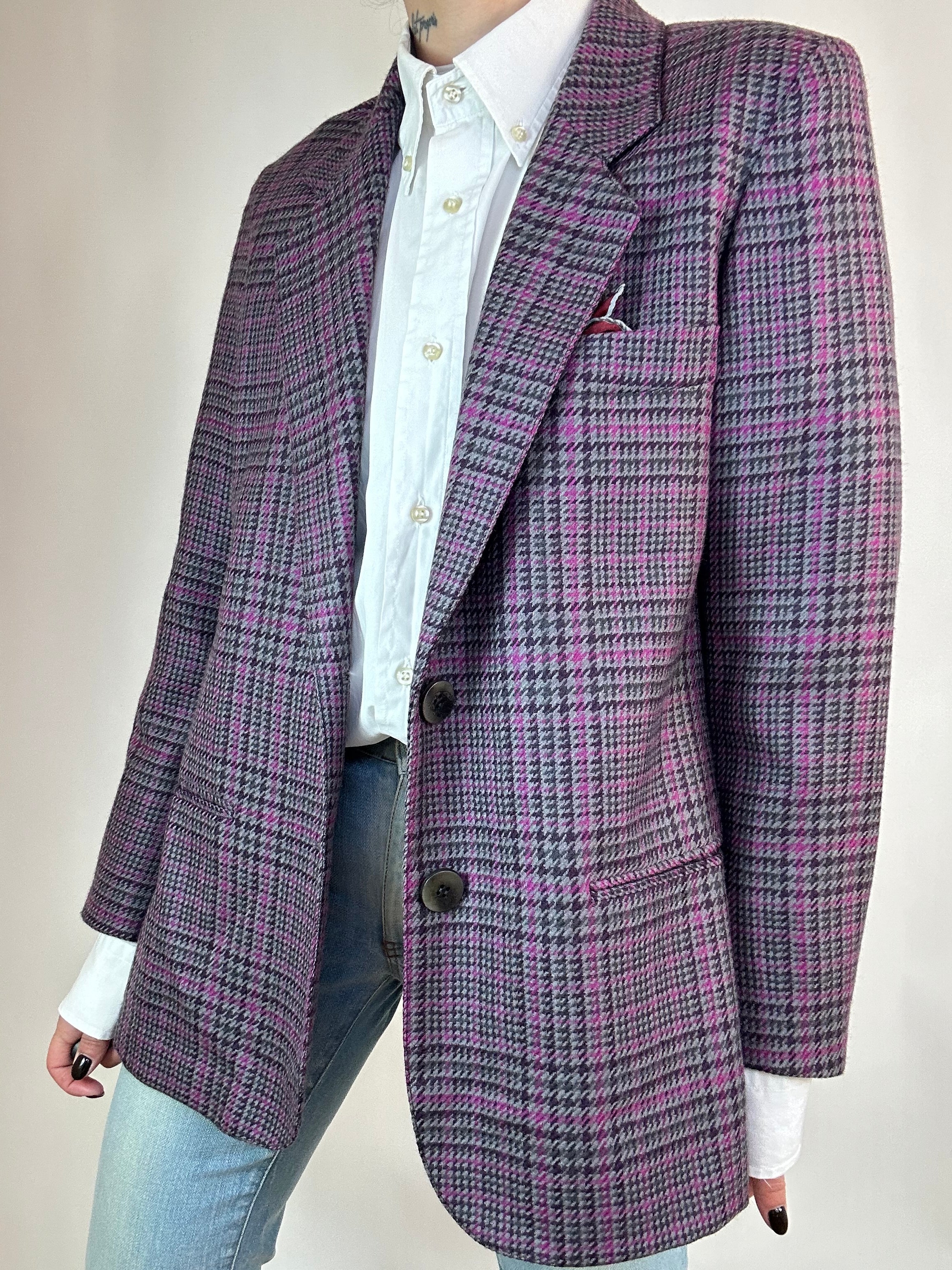 Blazer viola a quadri donna taglia 46 in pura lana vergine Vestibilità donna: 40-42 Misure capo: Spalla a spalla 41cm, Lunghezza 70cm Altezza modella: 1.65, taglia 42