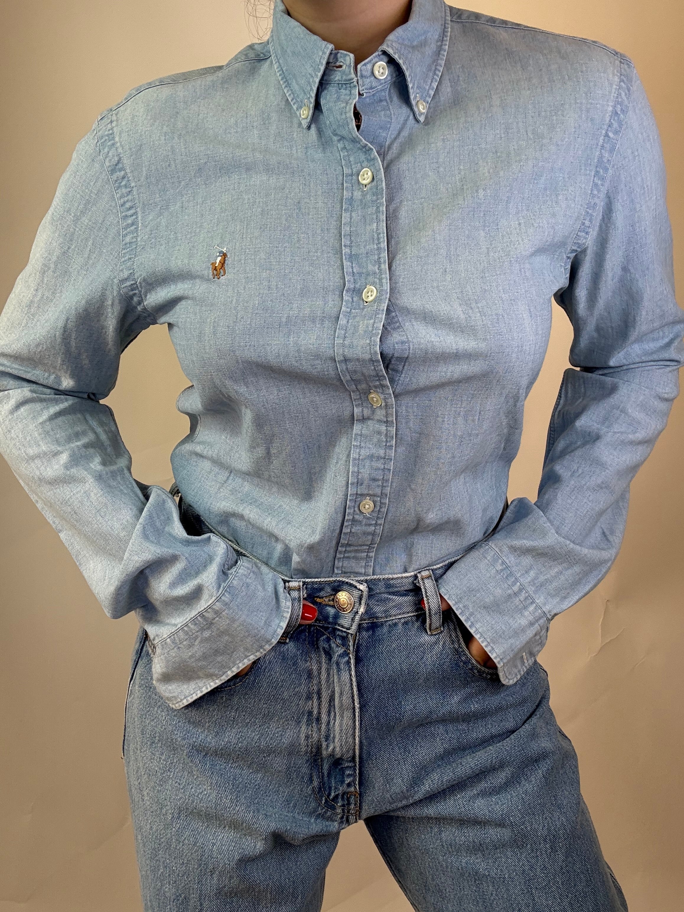 Camicia Ralph Lauren in Denim chiaro taglia S Slim Fit in 100% cotone Spalla a Spalla: 45cm Lunghezza totale: 79cm Taglia Modello\o:  42IT x 1,65cm