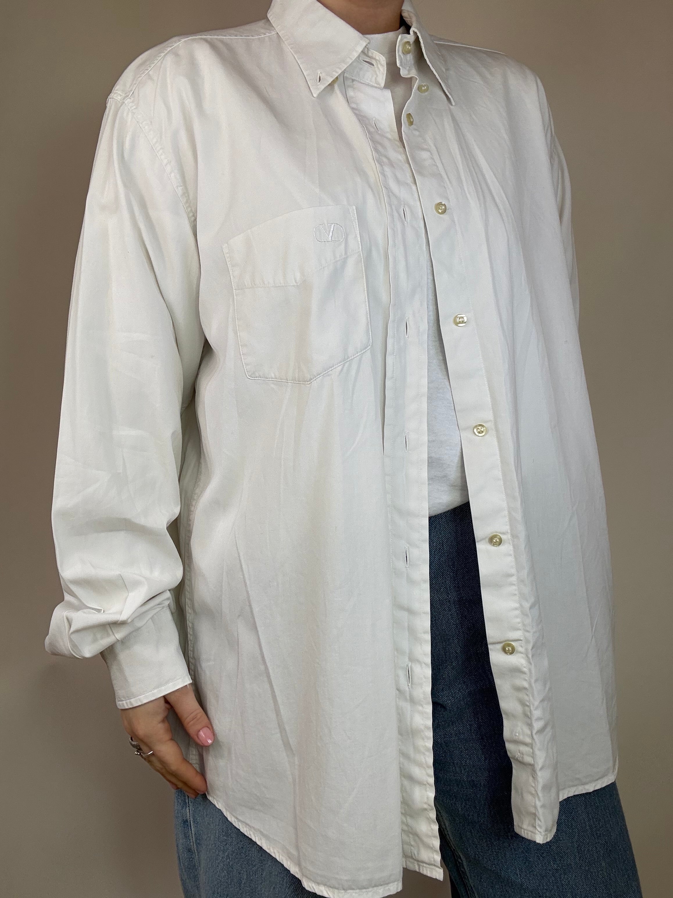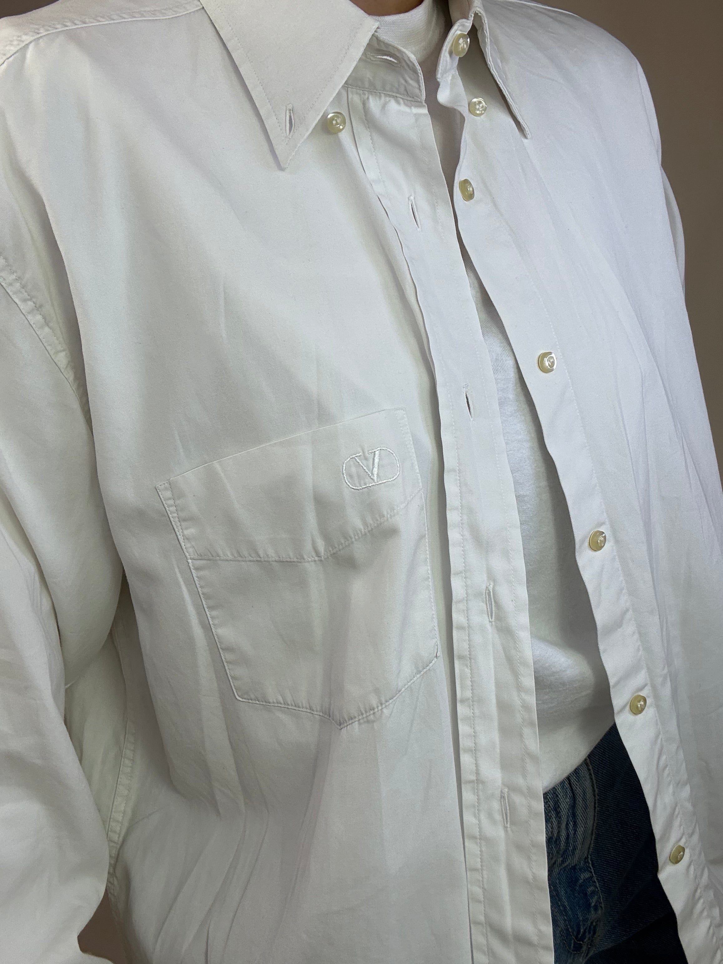 Camicia Valentino con logo sul taschino bianca taglia 42 16 1/2 in 100% cotone Vestibilità: 42-44 Misure capo: Spalla a spalla 50cm, lunghezza 82cm Modella/o: Taglia 42-44, Altezza 1.65