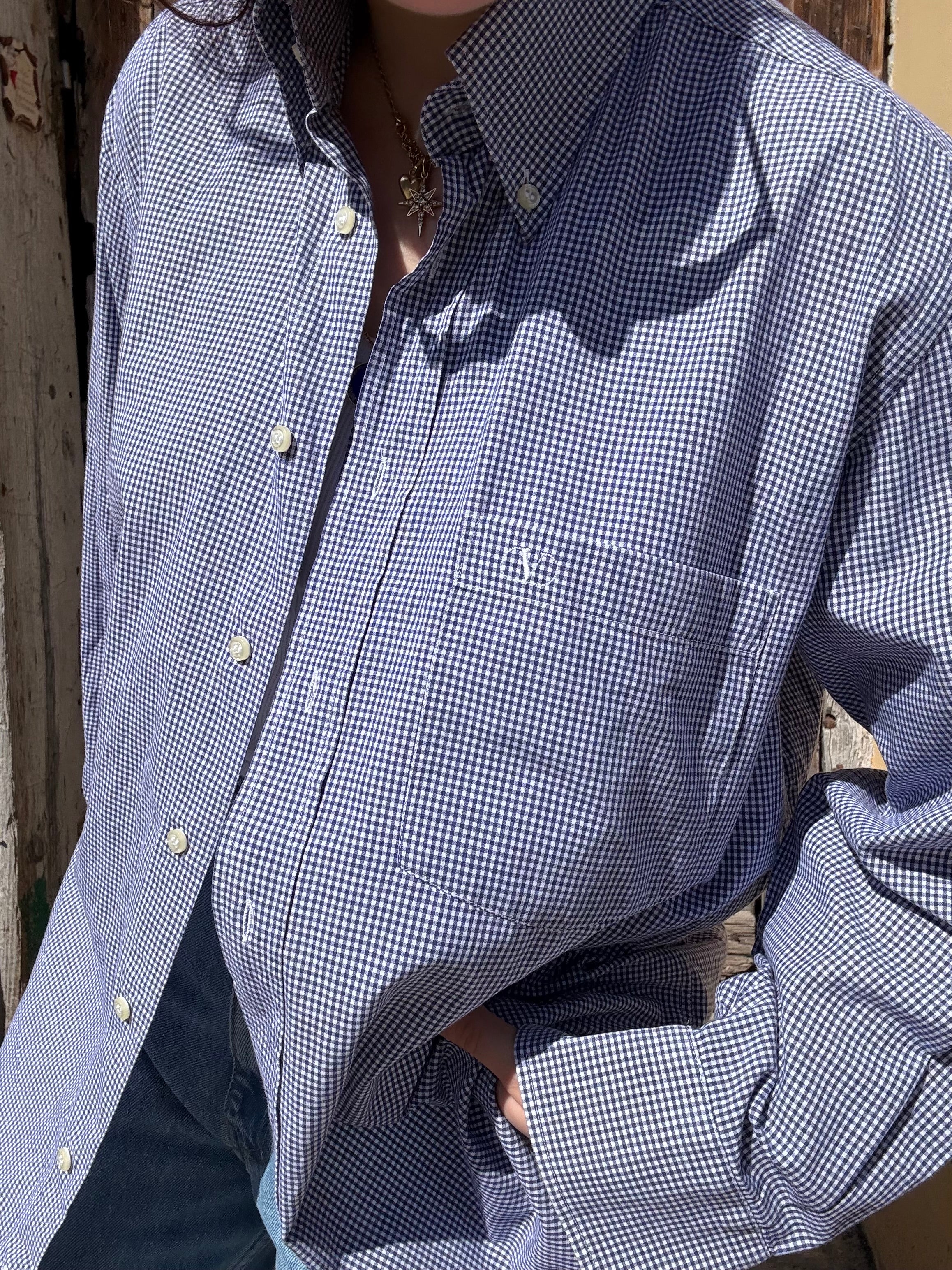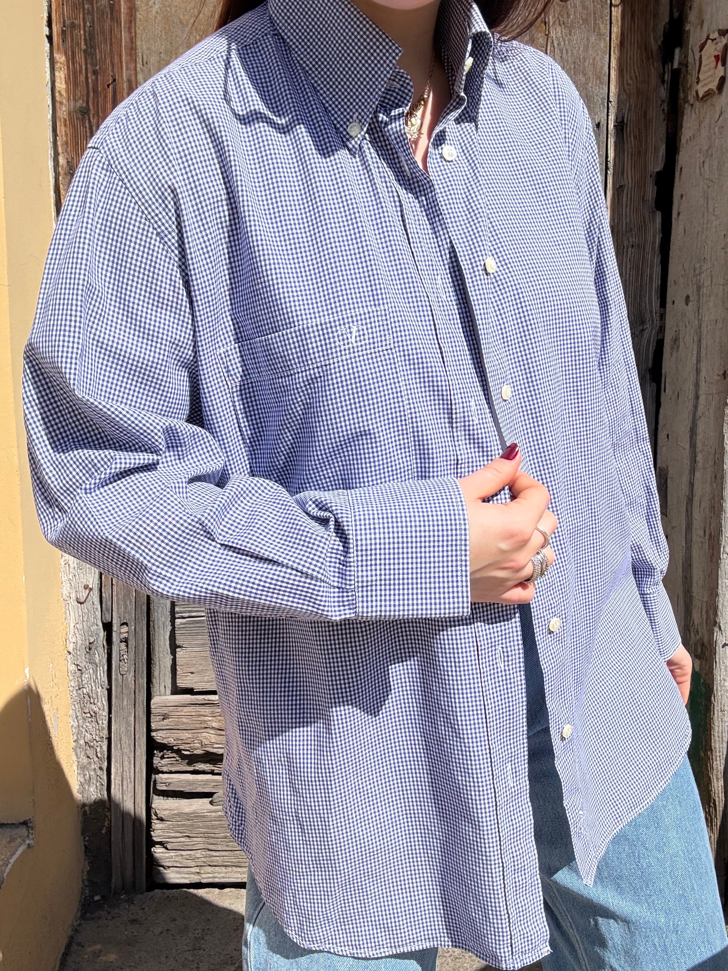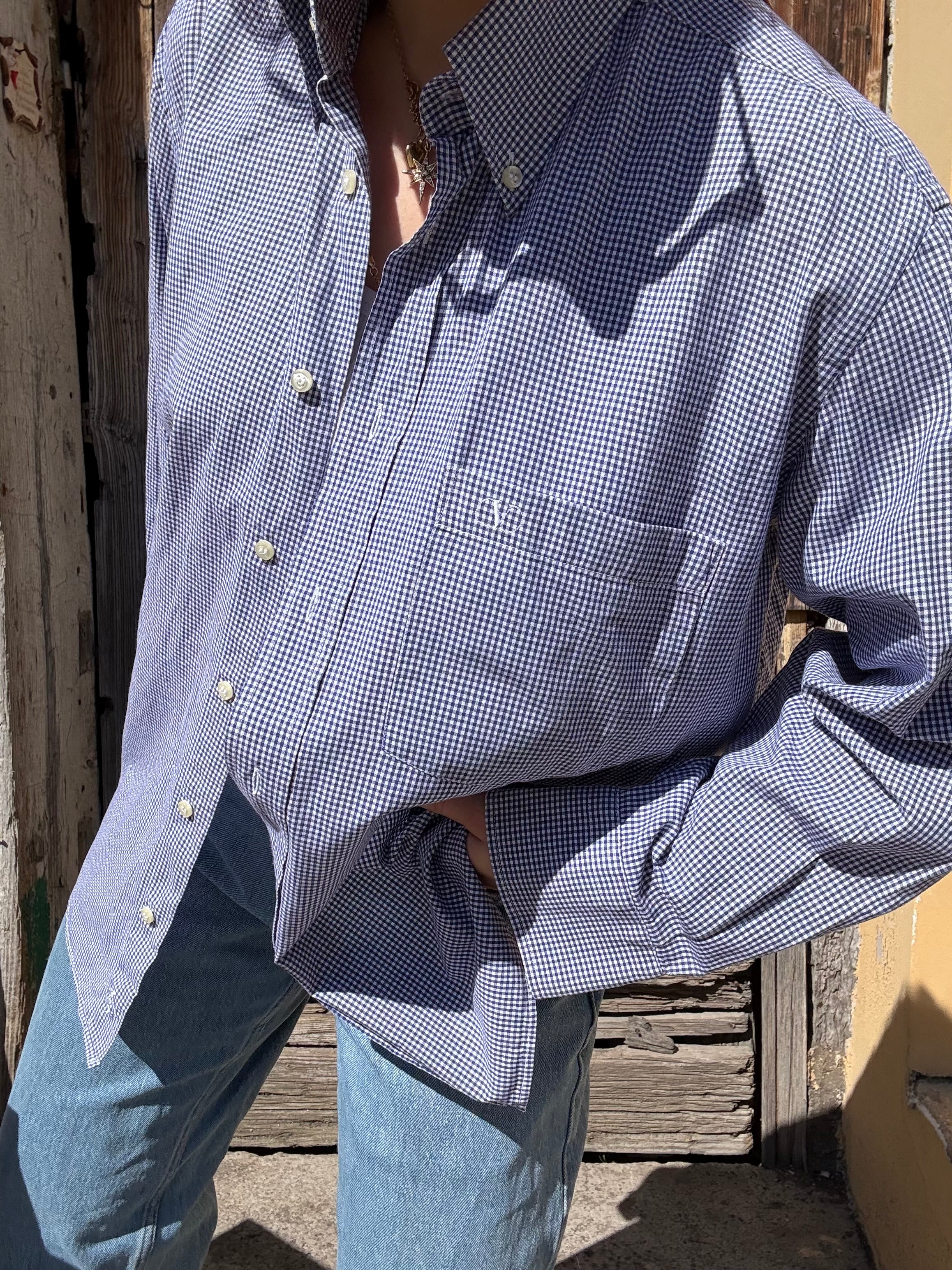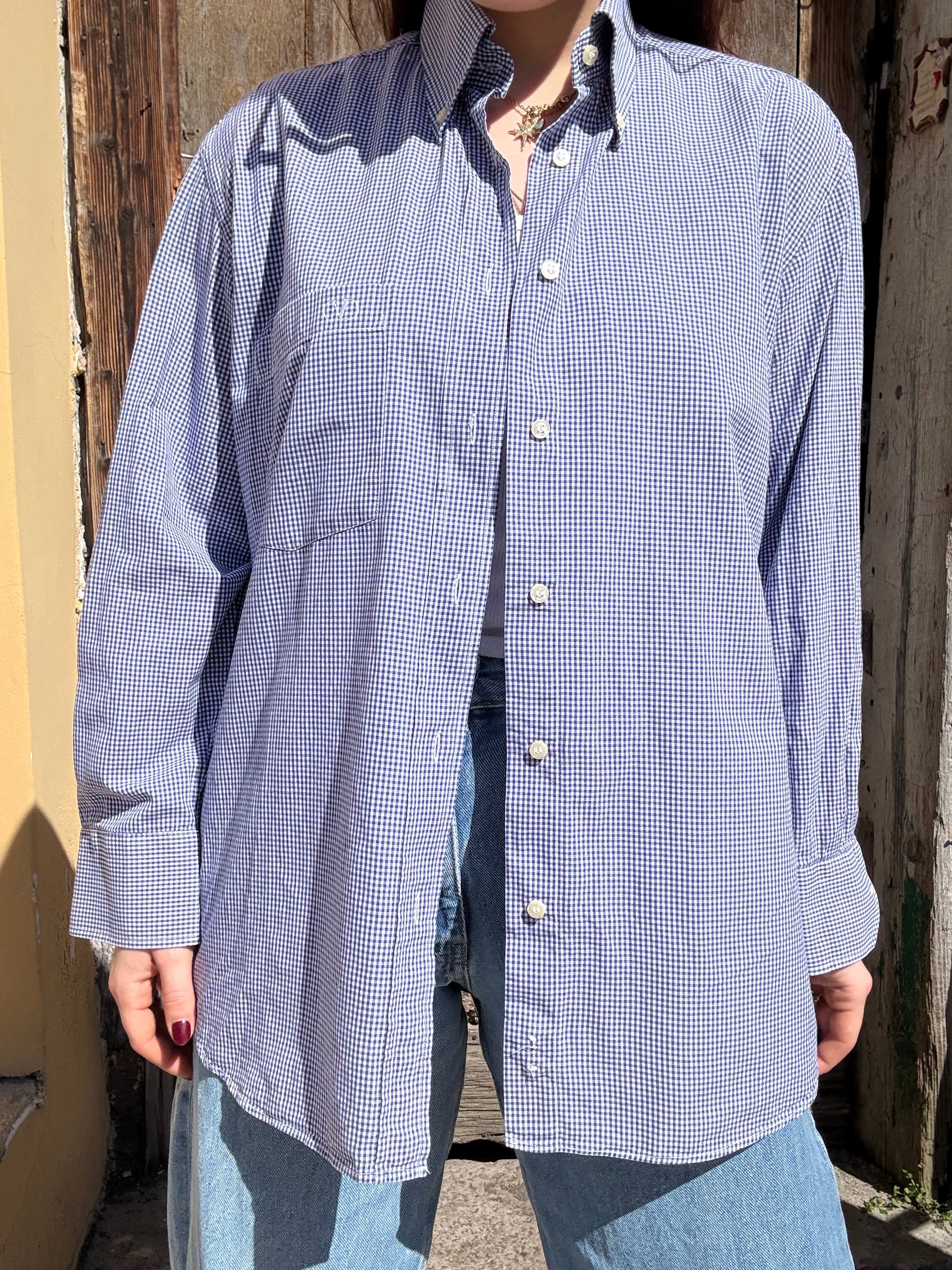 Camicia Valentino con logo sul taschino blu a quadrettini in 100% cotone taglia 40 15 1/2 Vestibilità donna: 42-44  Misure capo: Spalla a spalla 50cm , lunghezza 78cm  Altezza modella: 1.65 Taglia 42