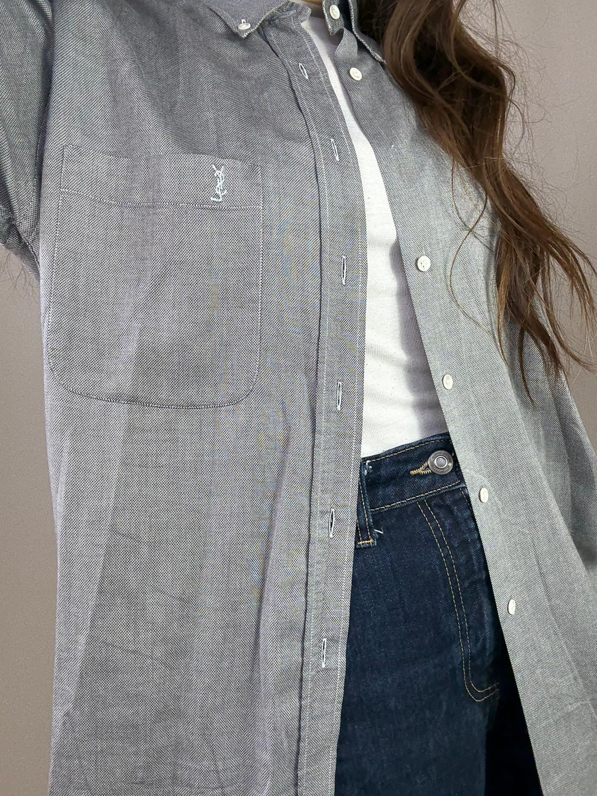 Camicia Ysl con logo sul taschino taglia 16/41 in 100% cotone Vestibilità donna: 42-44 (44 Over)  Misure capo: Spalla a spalla 51cm, Lunghezza 80cm Altezza modella: 1.65, taglia 42