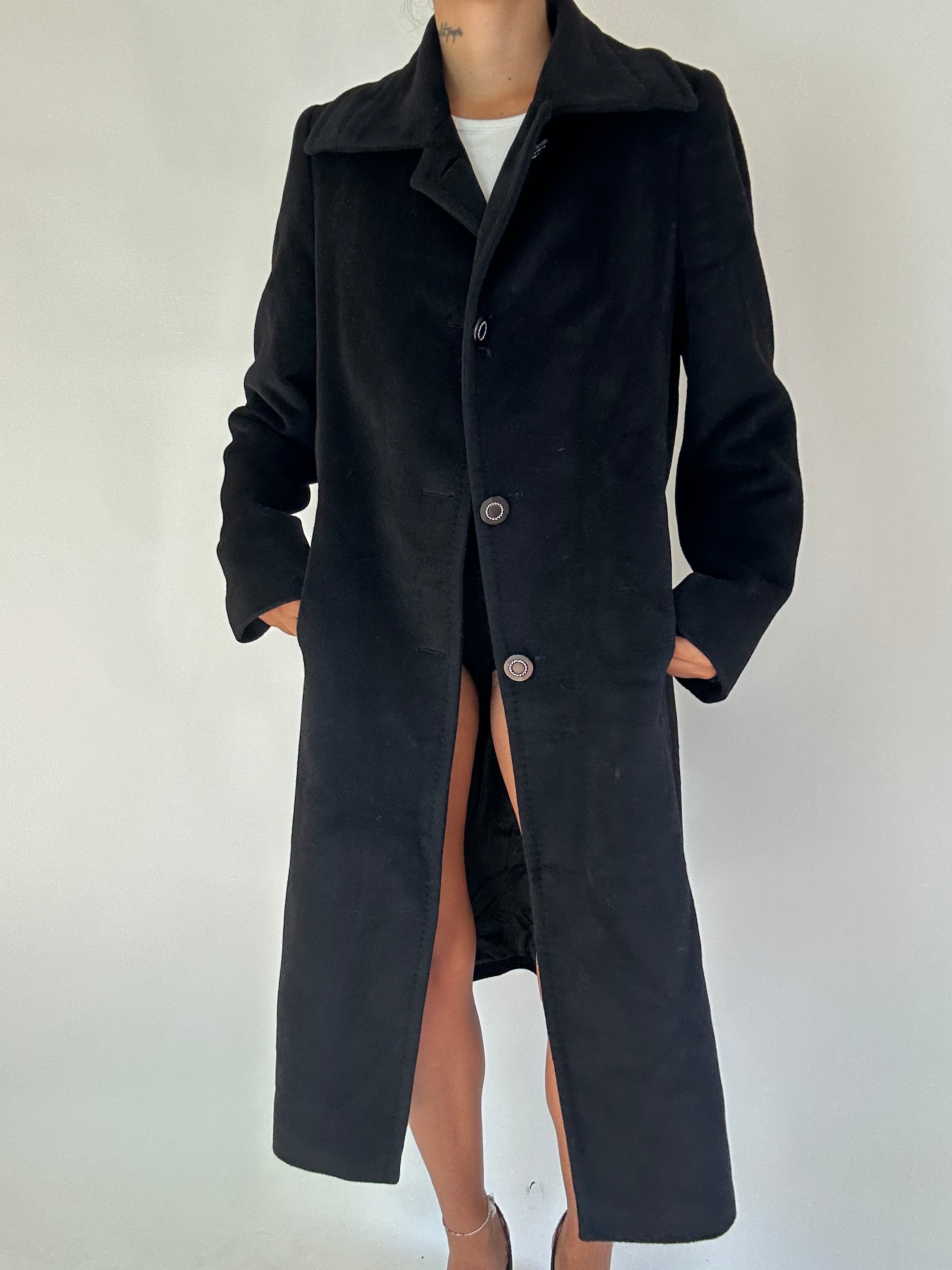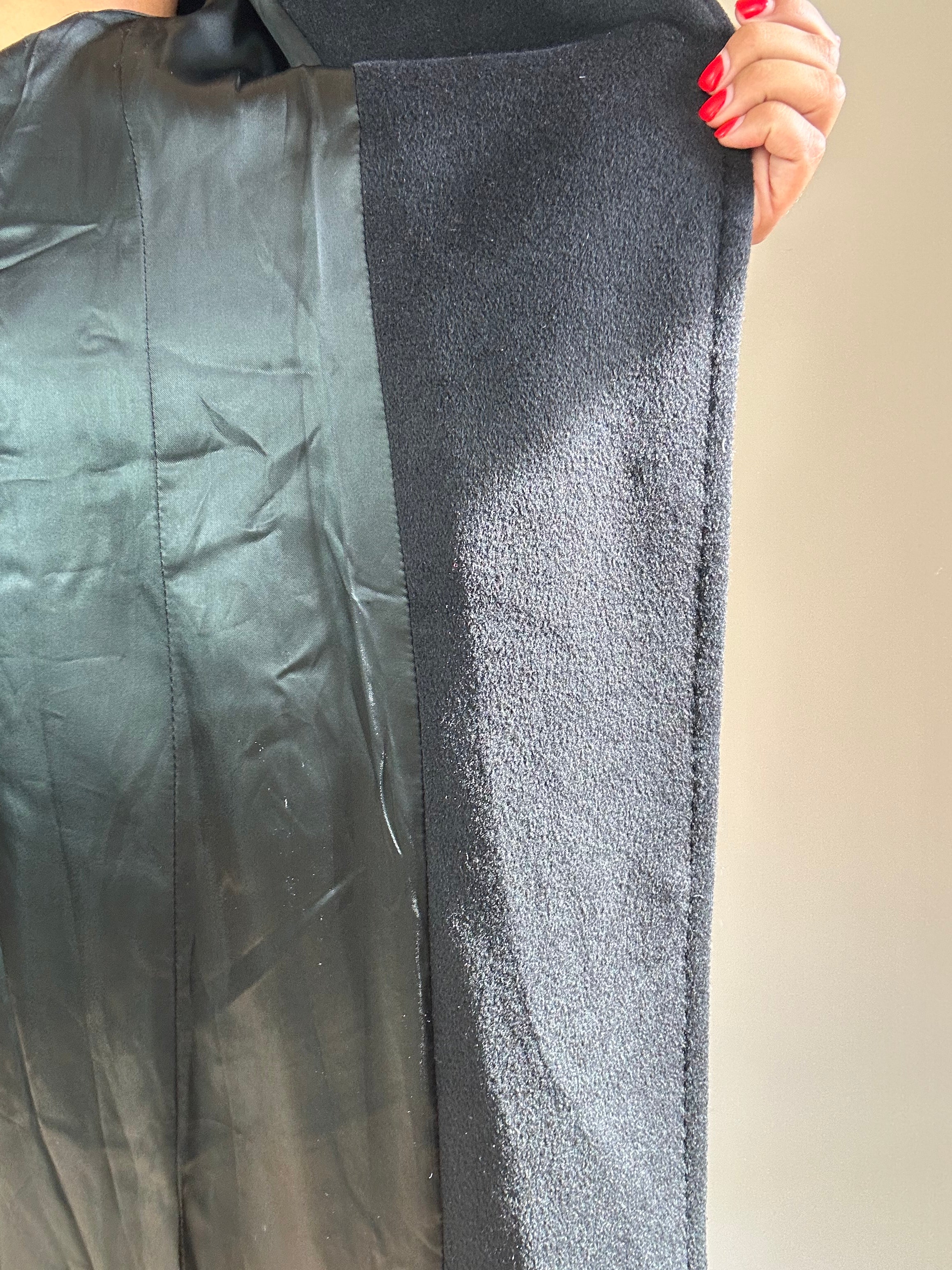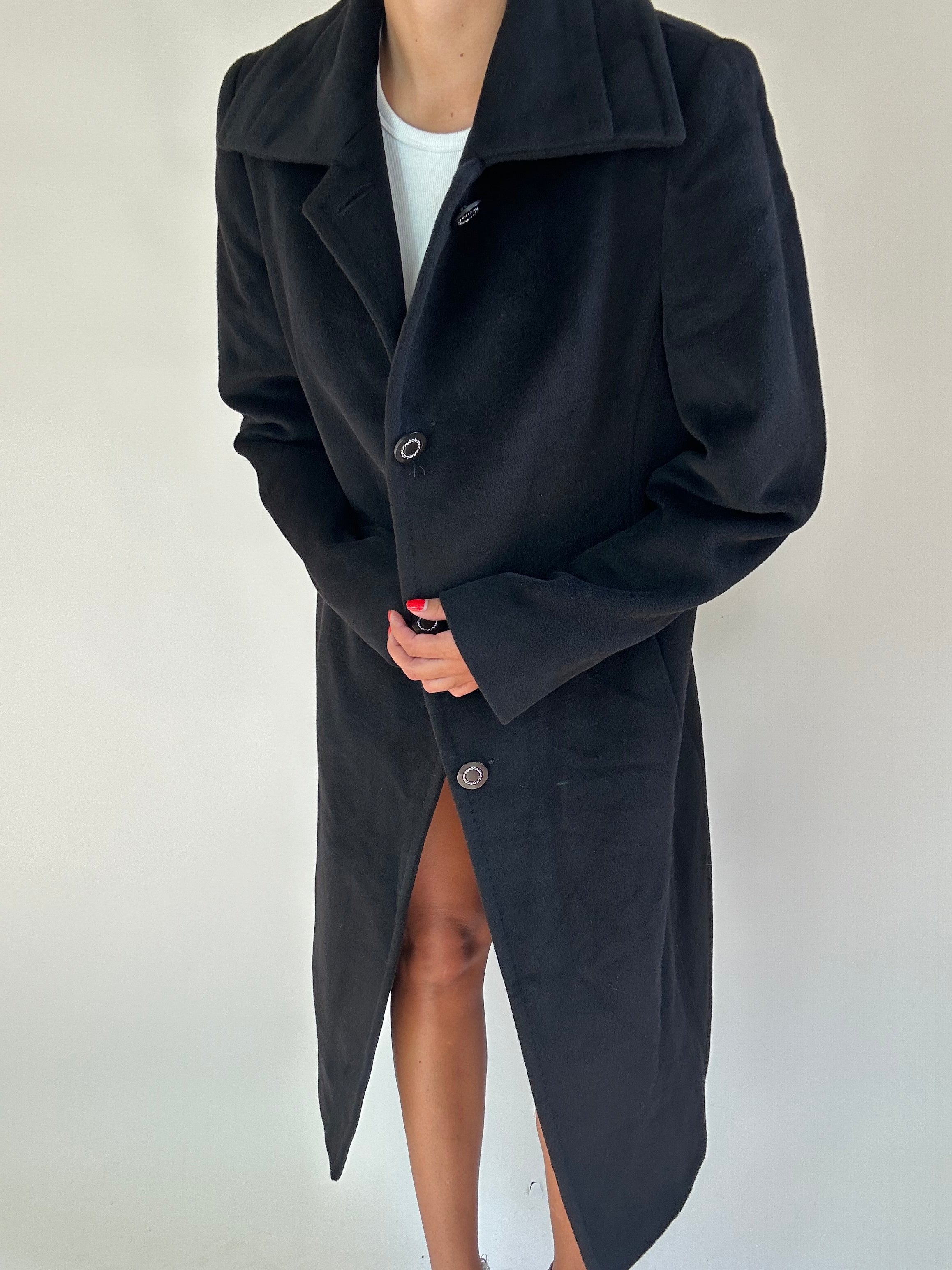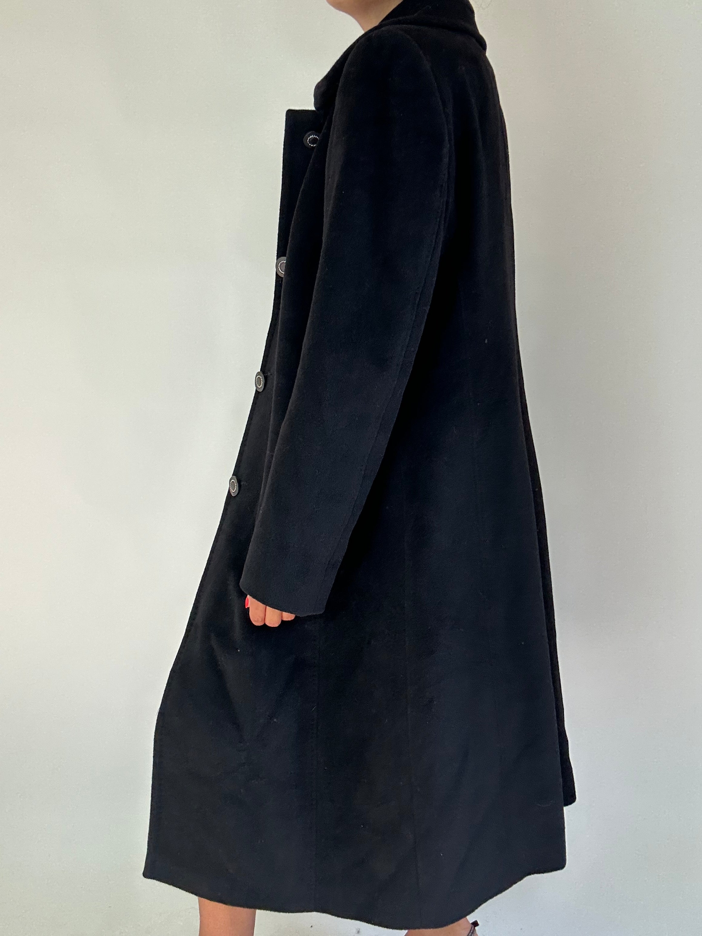 Cappotto nero taglia 48 in 50% Lana 40% Angora 10% Cashgora Spalla a Spalla: 43cm Lunghezza totale: 110cm  Taglia Modello\a:  42IT x 1,70