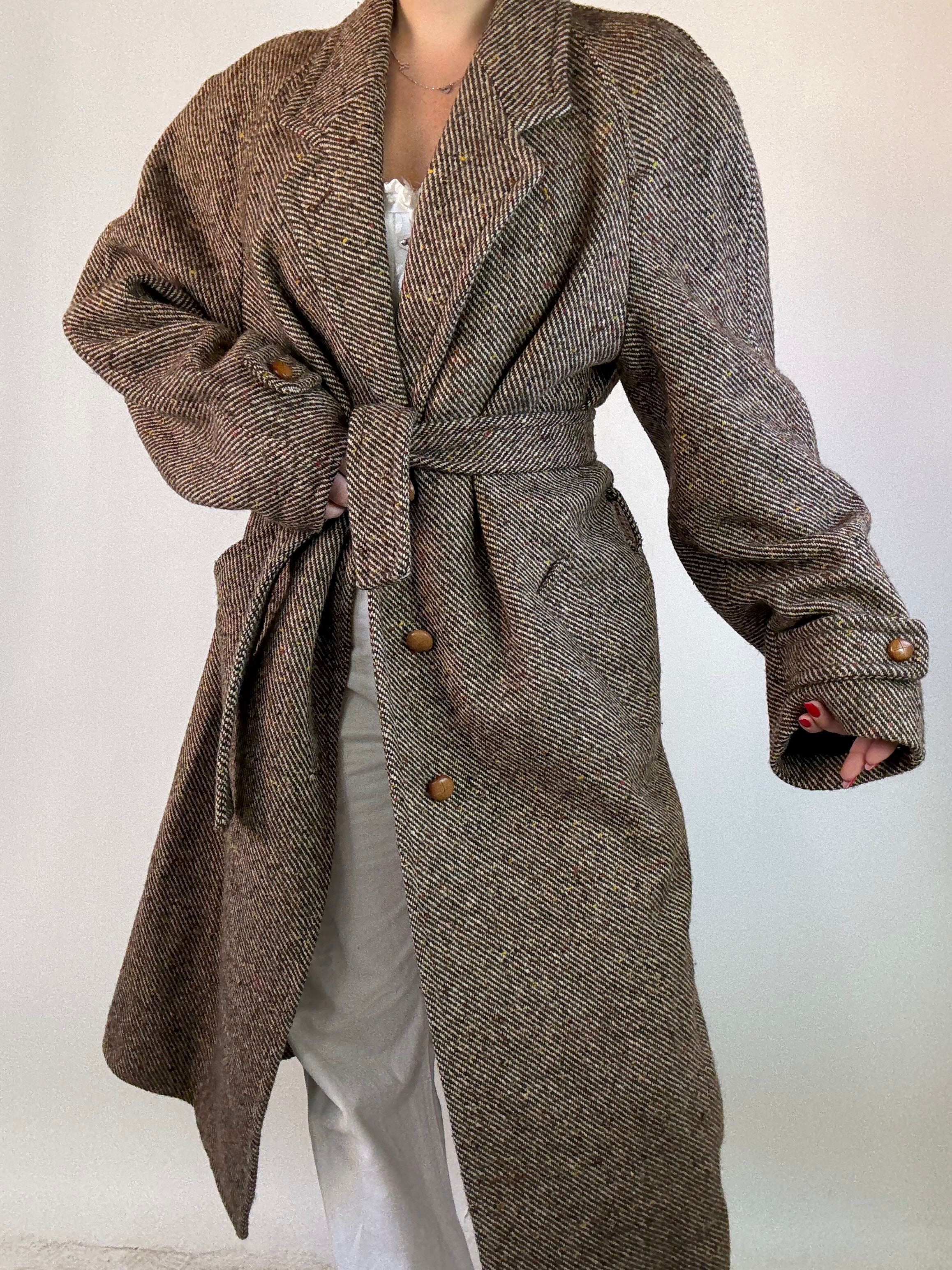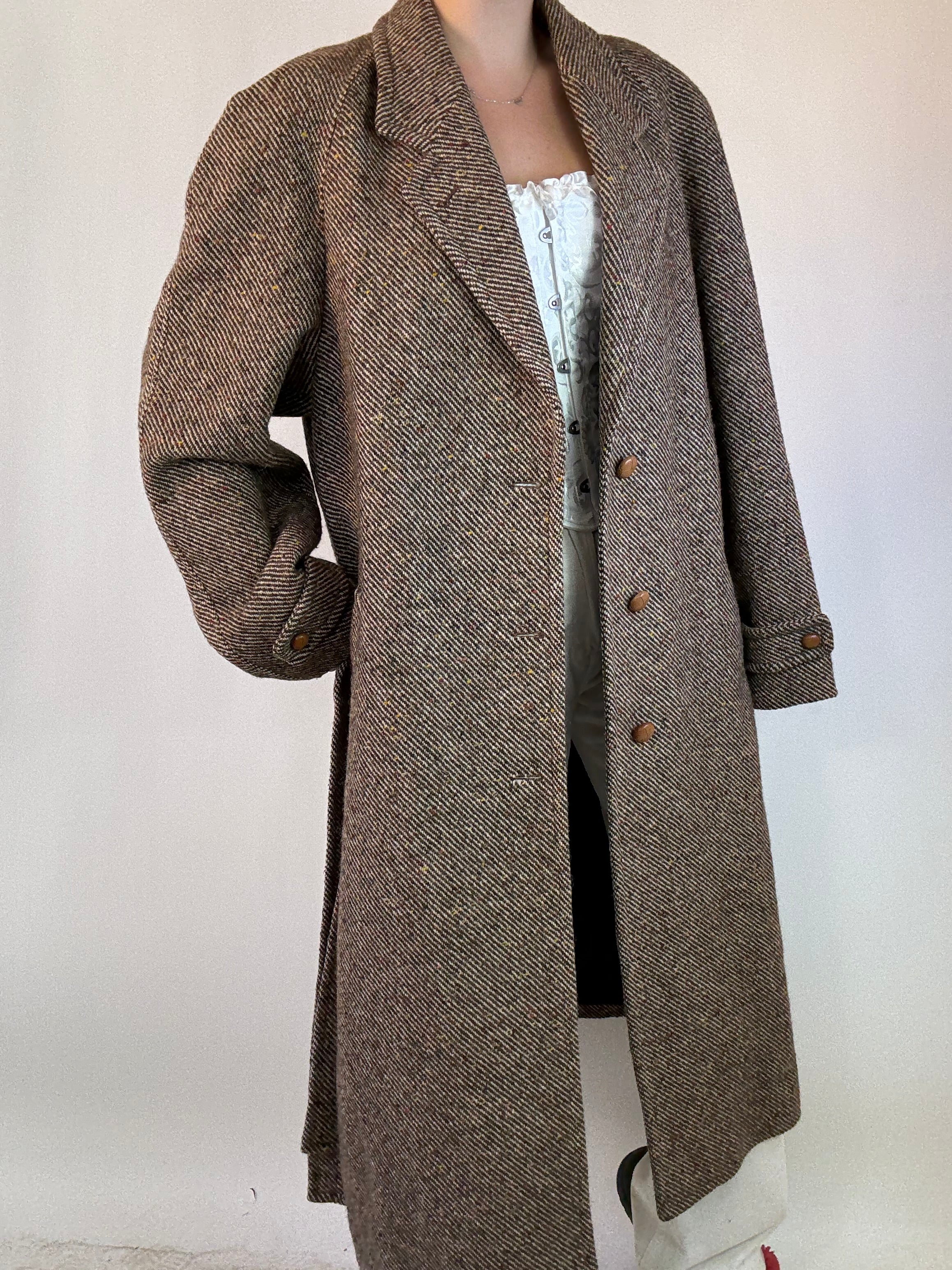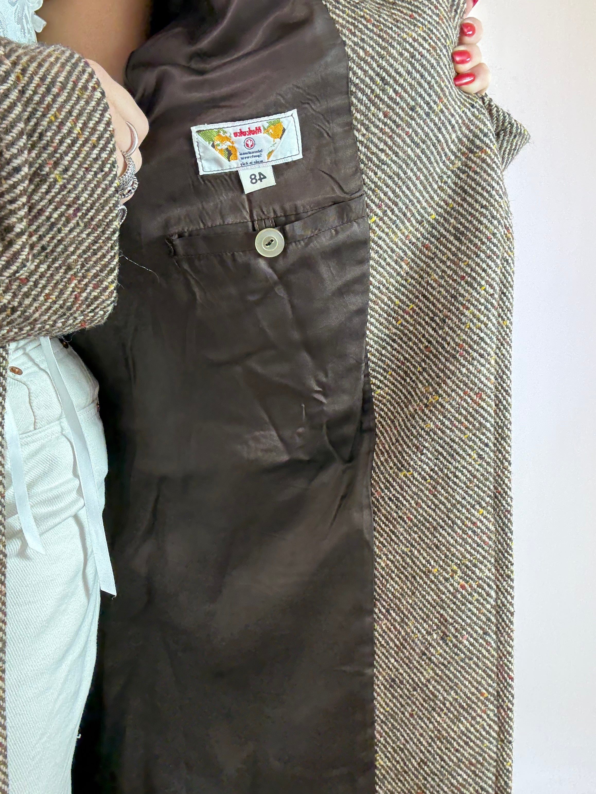Cappotto spigato marrone taglia 48 in lana e poliamide Misure capo: Spalla a spalla 48cm, Lunghezza 126cm Altezza modella: 1.65, taglia 42