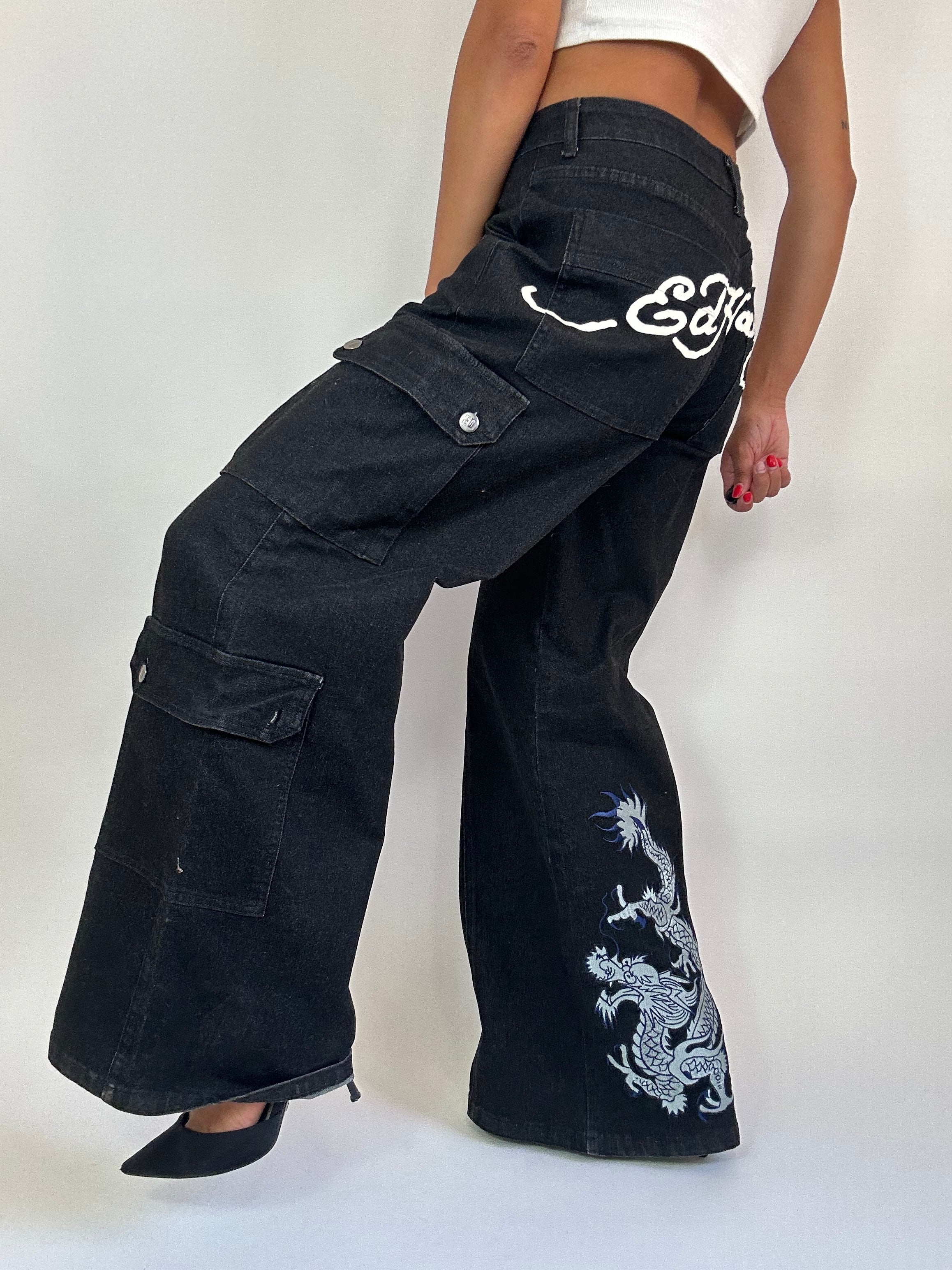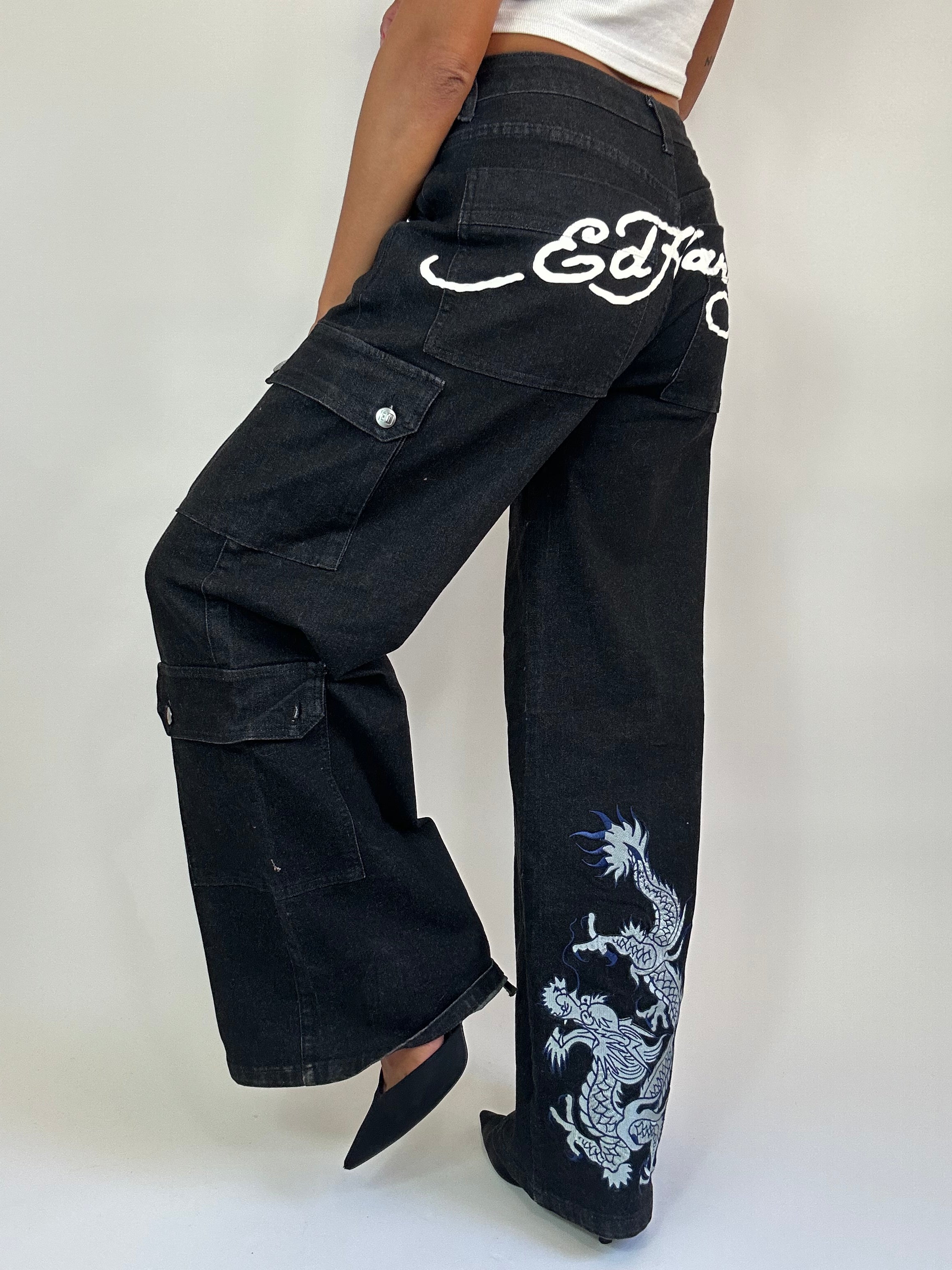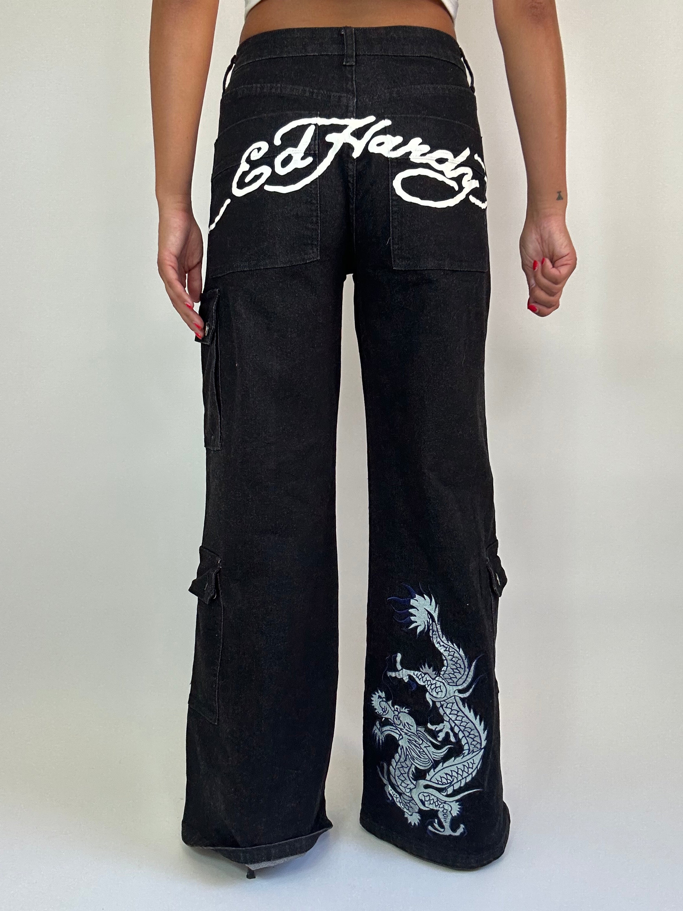 Cargo nero con stampa dragone taglia S  vita piatta: 38cm Lunghezza totale: 104cm Taglia Modello\a:  42IT x 1,70