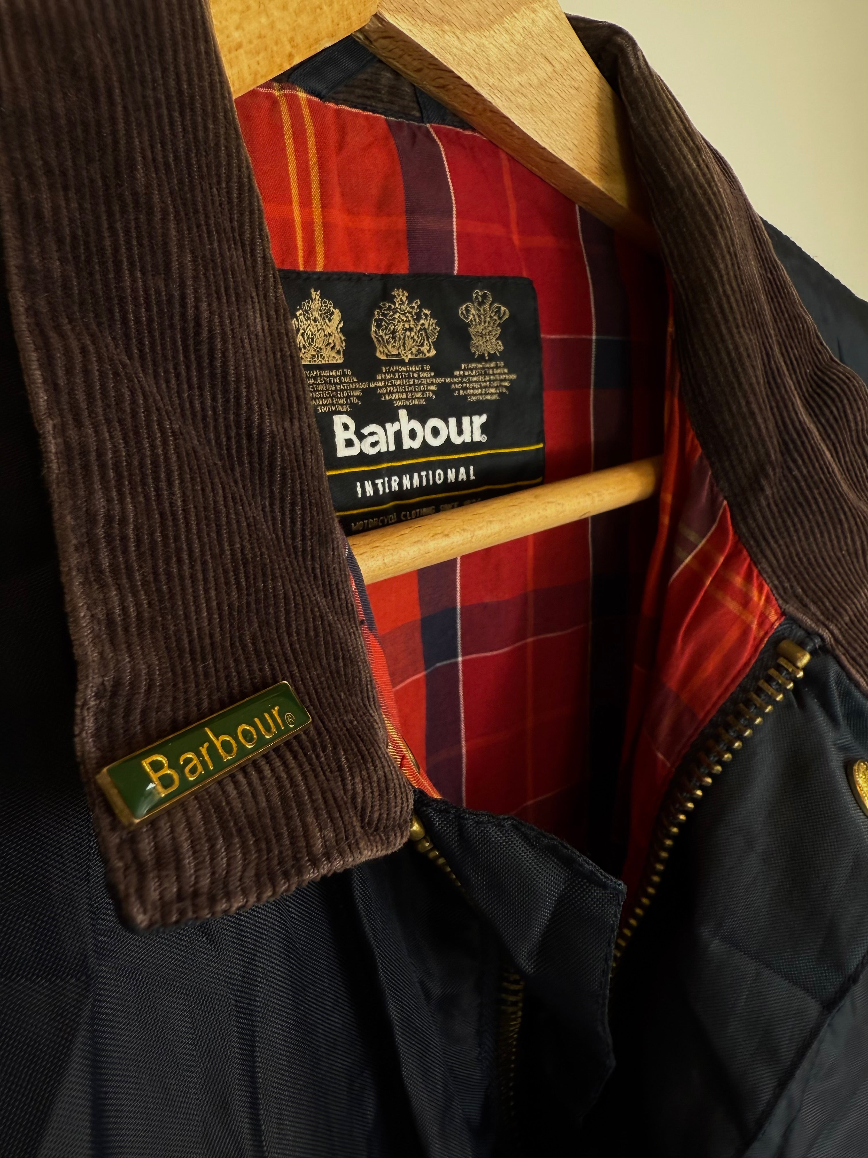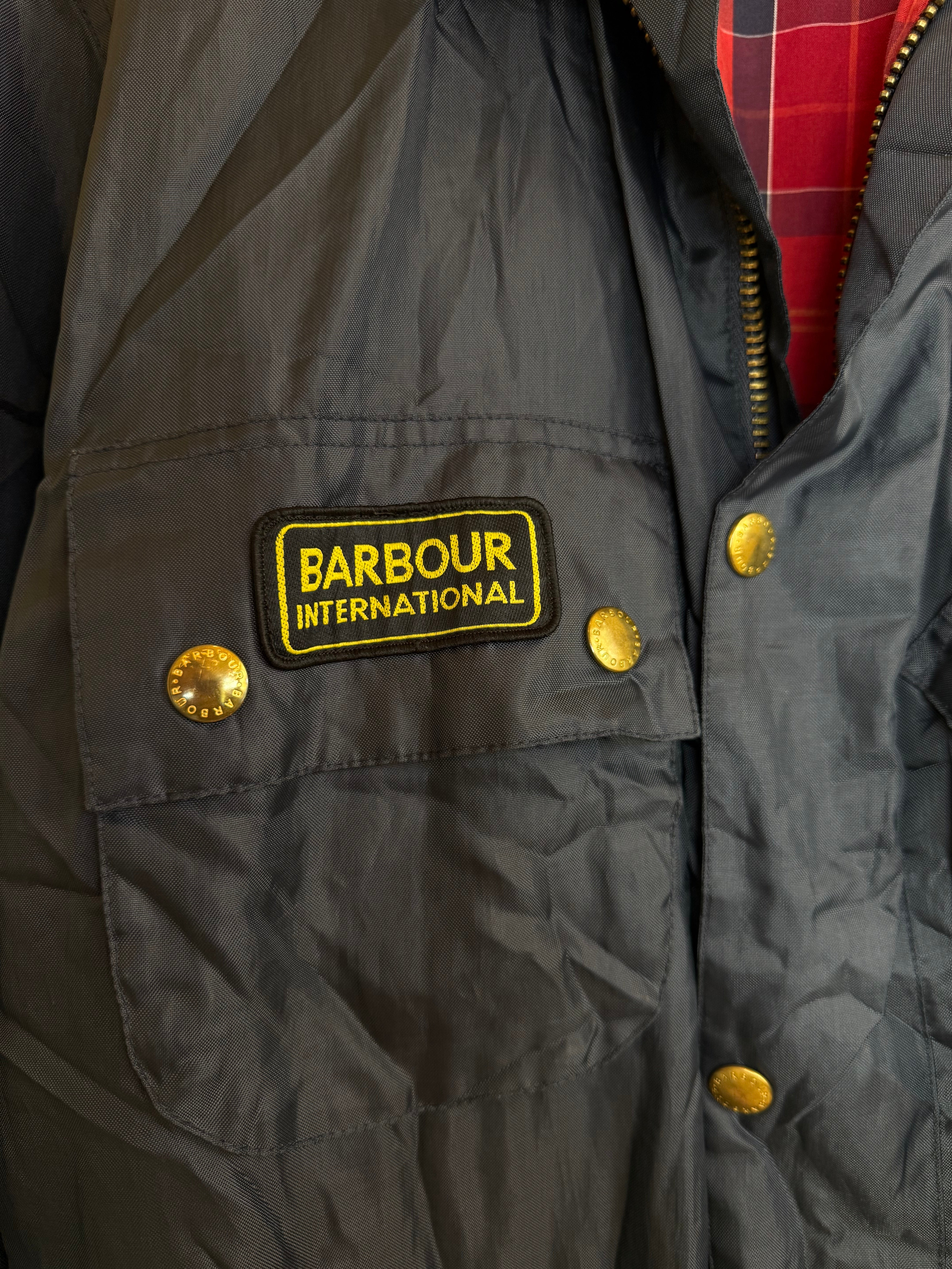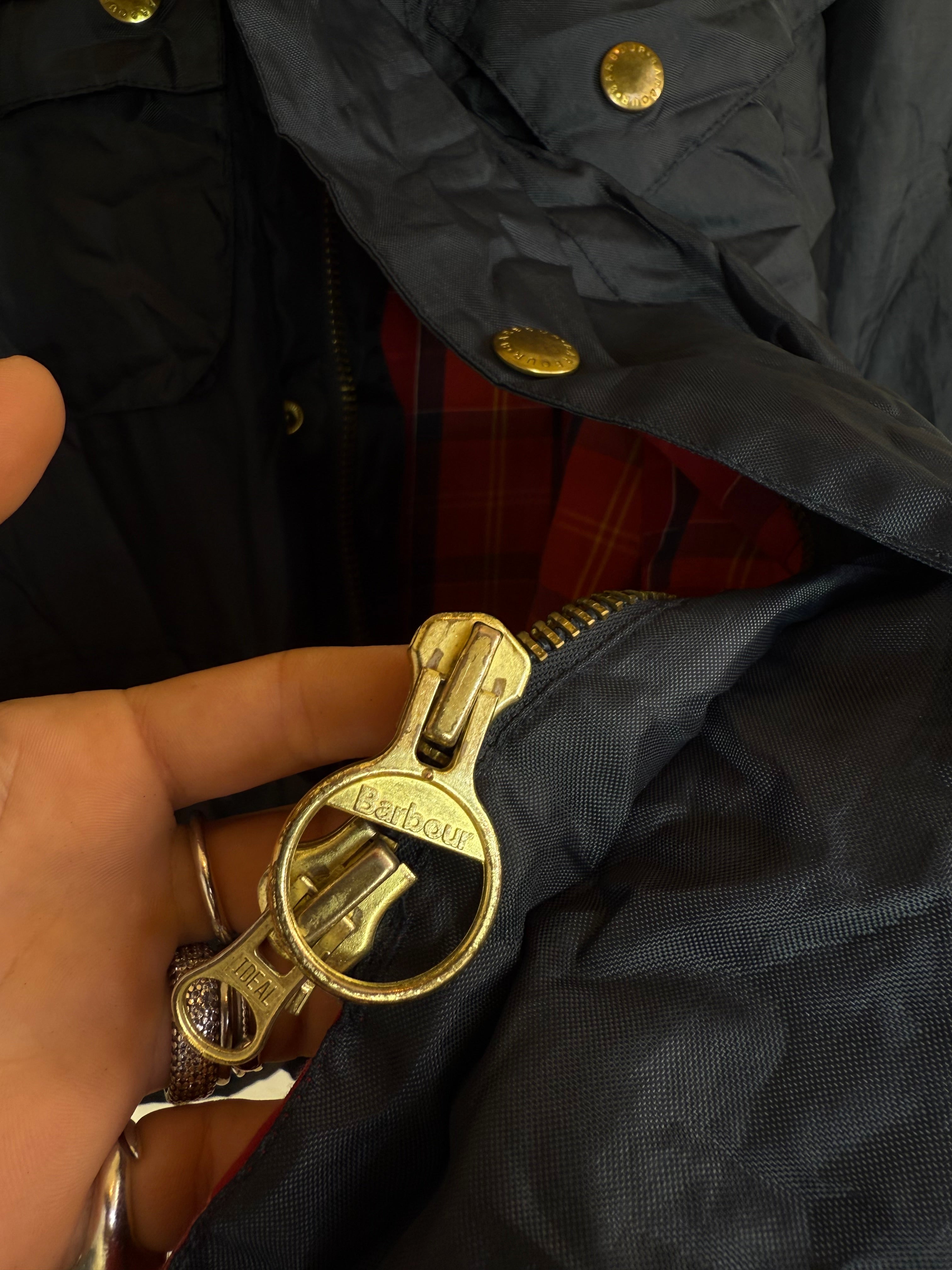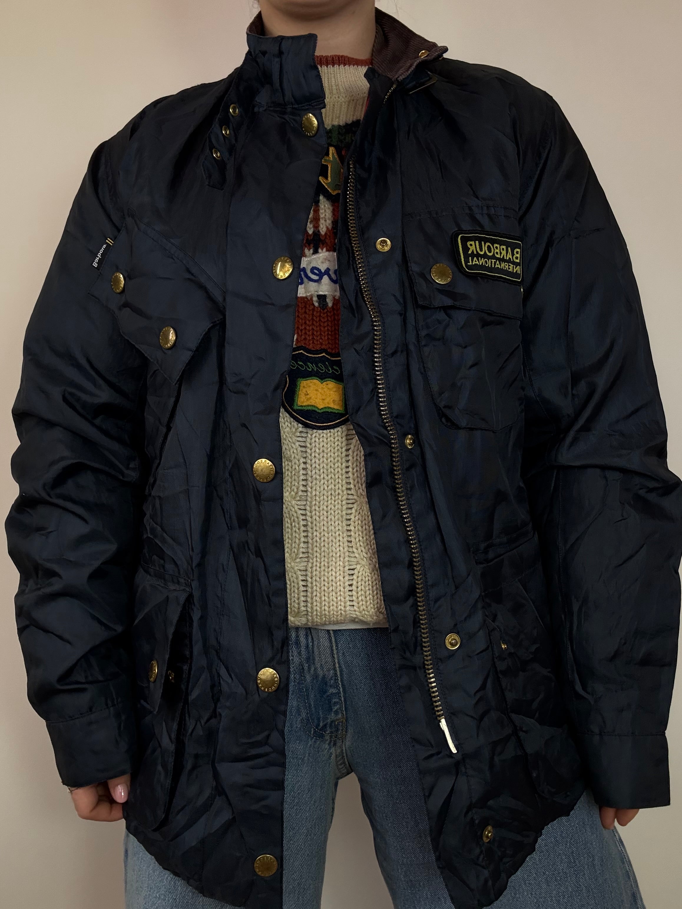Giacca Barbour acetata con spilla originale Barbour taglia M Blu Navy Vestibilità: 42-44 Misure capo: Spalla a spalla 48cm, lunghezza 77cm Modella/o: Taglia 42-44, Altezza 1.65