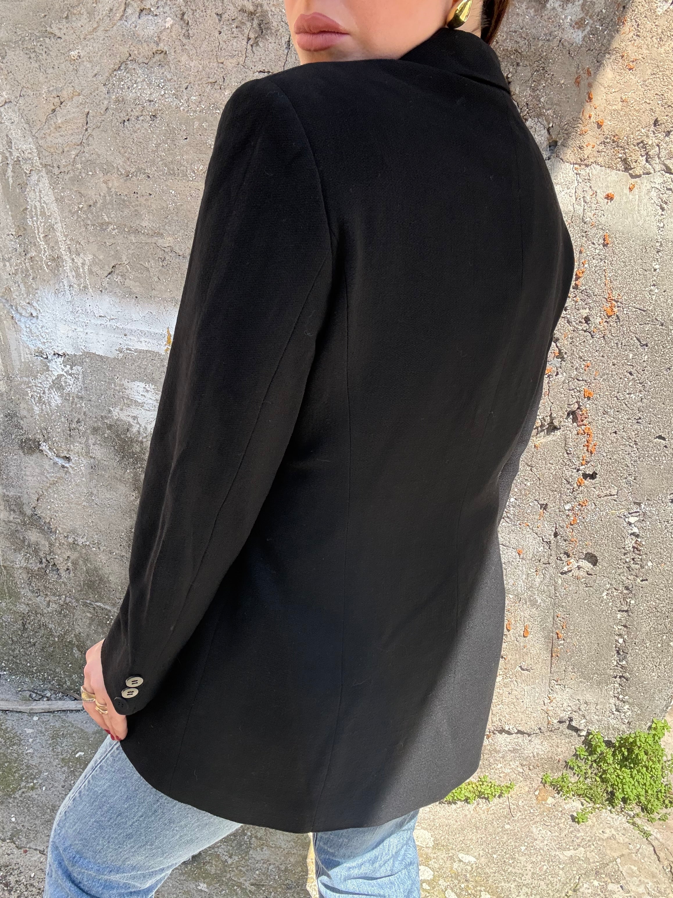 Giacca doppiopetto Max Mara nera in pura lana vergine 46 Vestibilità donna: 40-42 Misure capo:  Spalla a spalla 43cm Lunghezza 72cm  Altezza modella: 1.70 Taglia 42