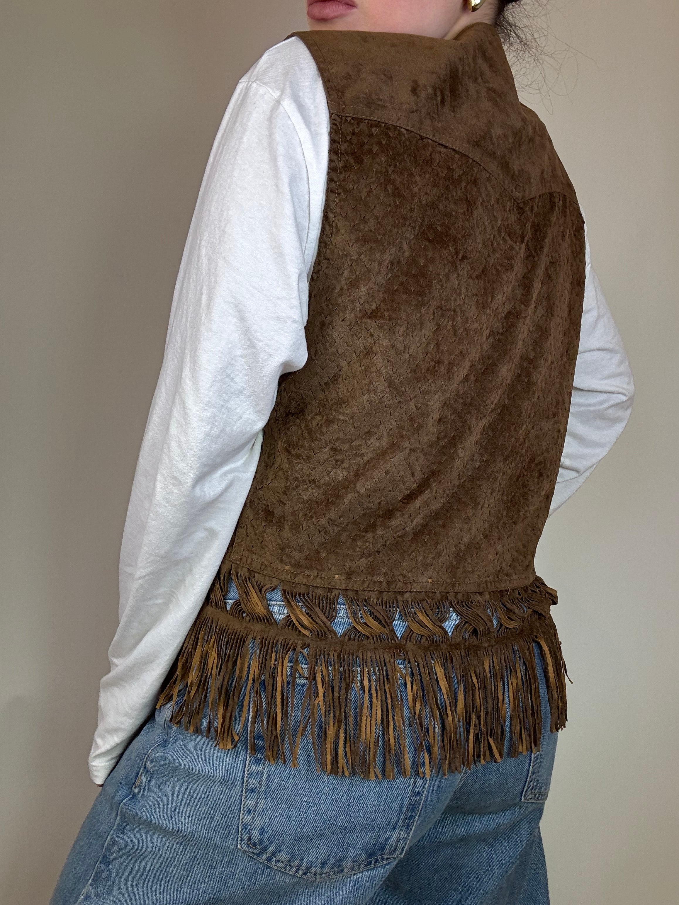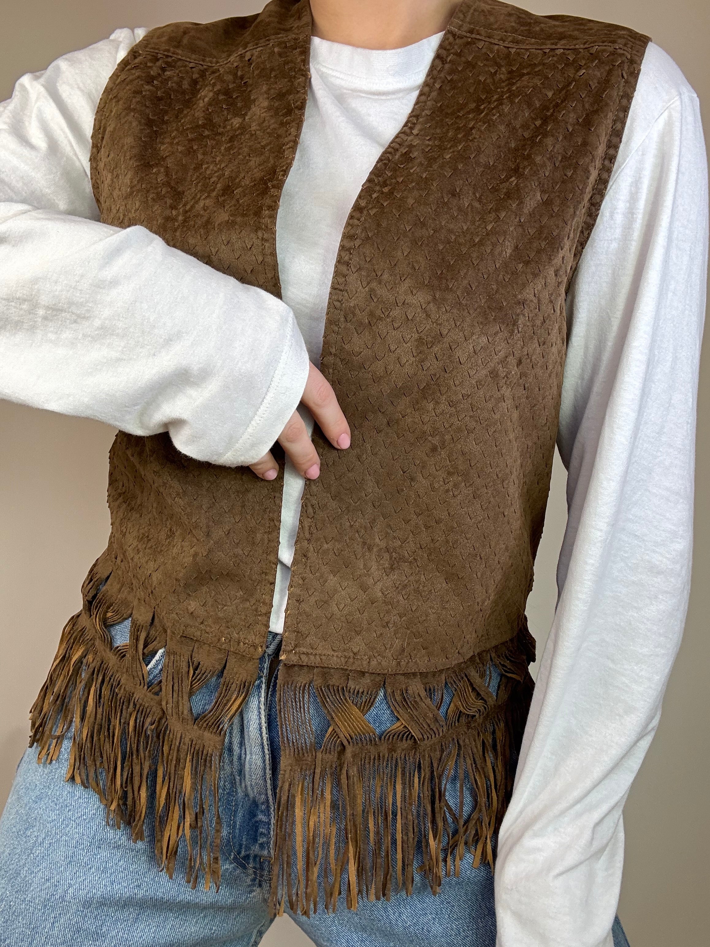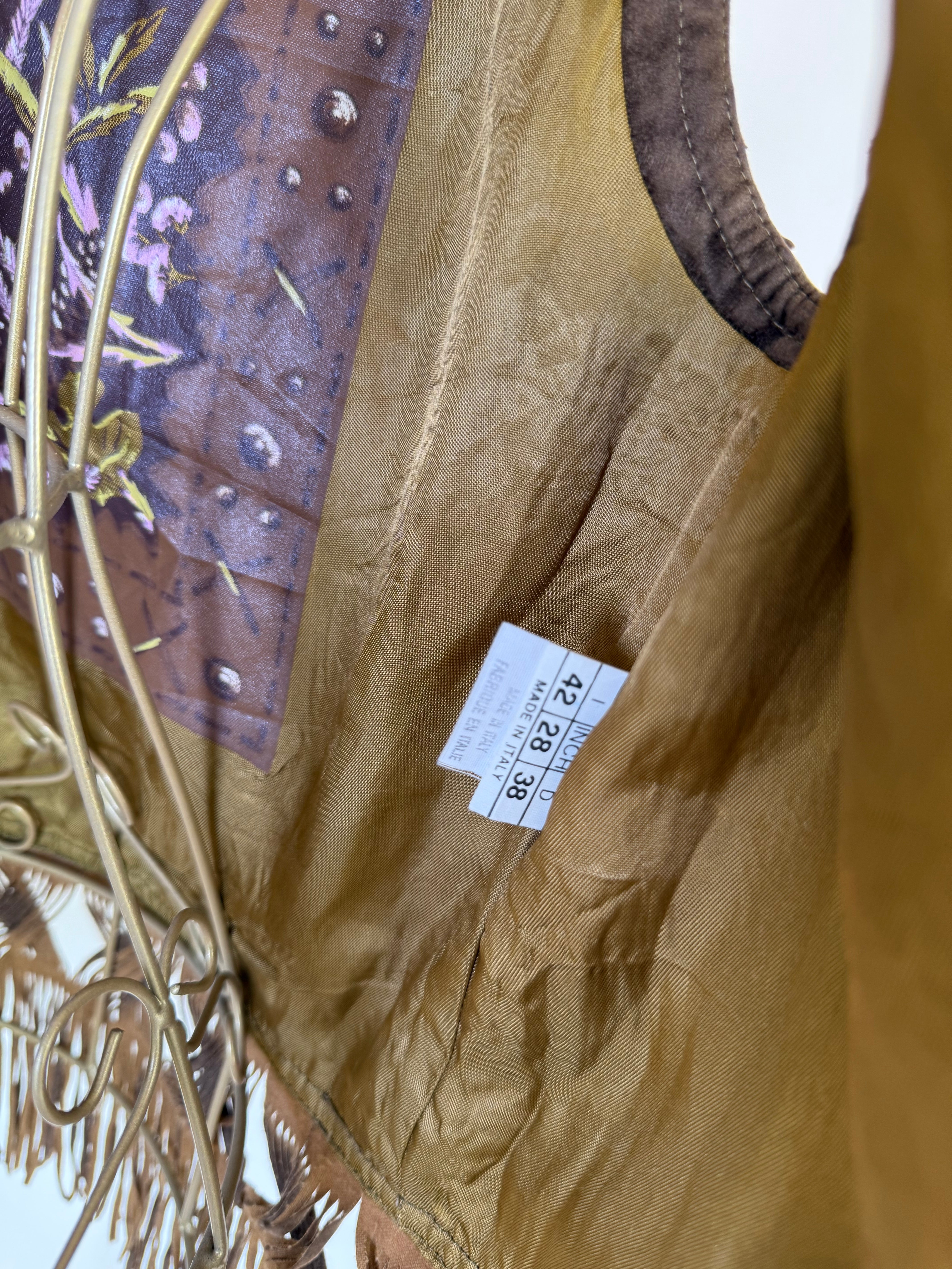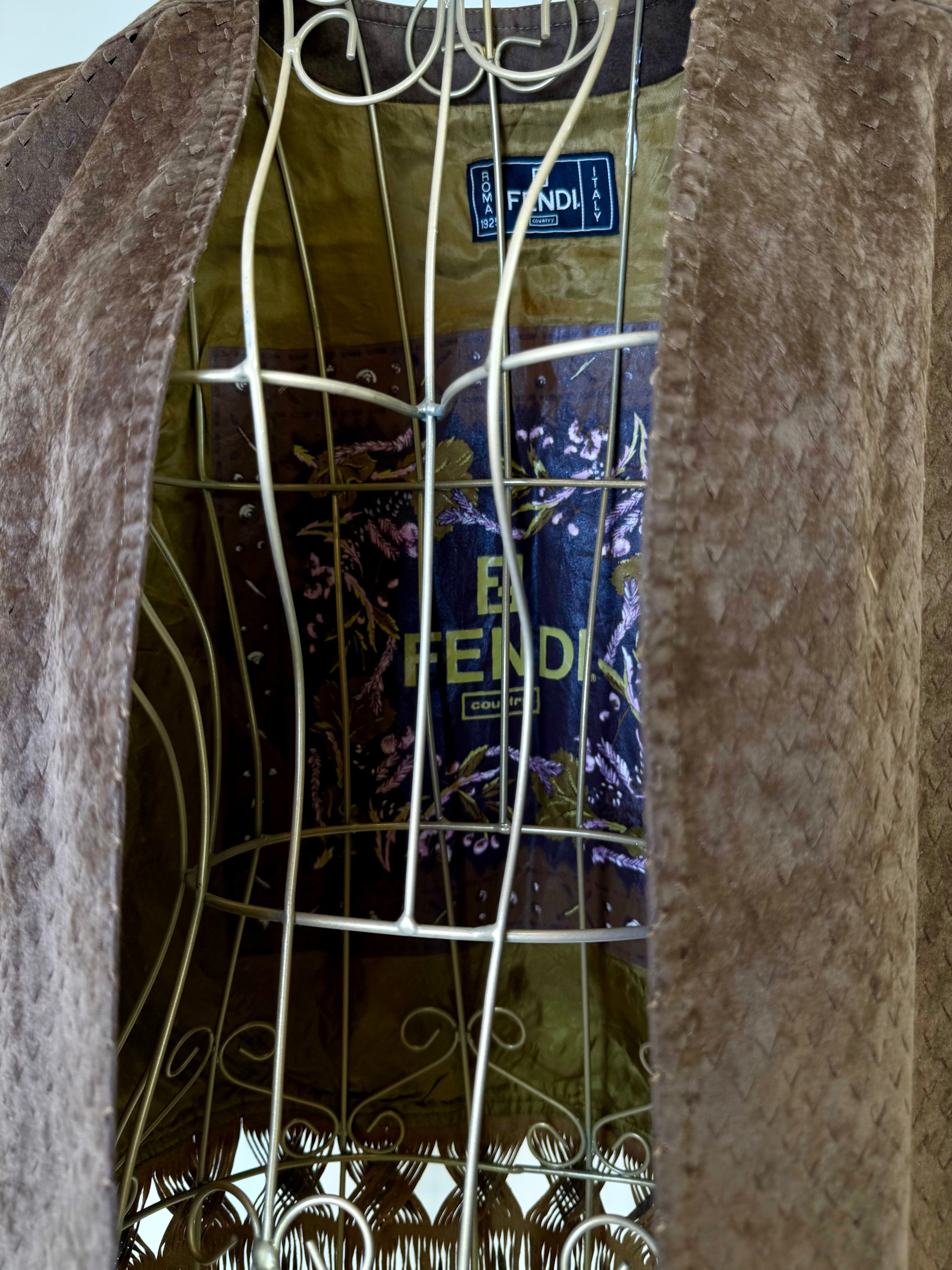 Gilet con Frange Fendi in camoscio taglia 42, 40% cotone 40% elastic 20% poliestere  Vestibilità: 42 Misure capo: Spalla a spalla 40cm, lunghezza 61cm Modella/o: Taglia 42-44, Altezza 1.65