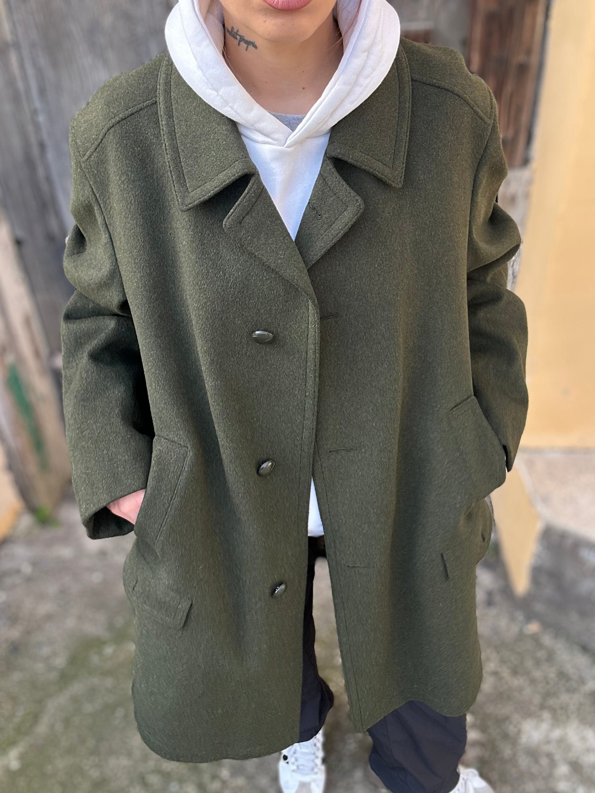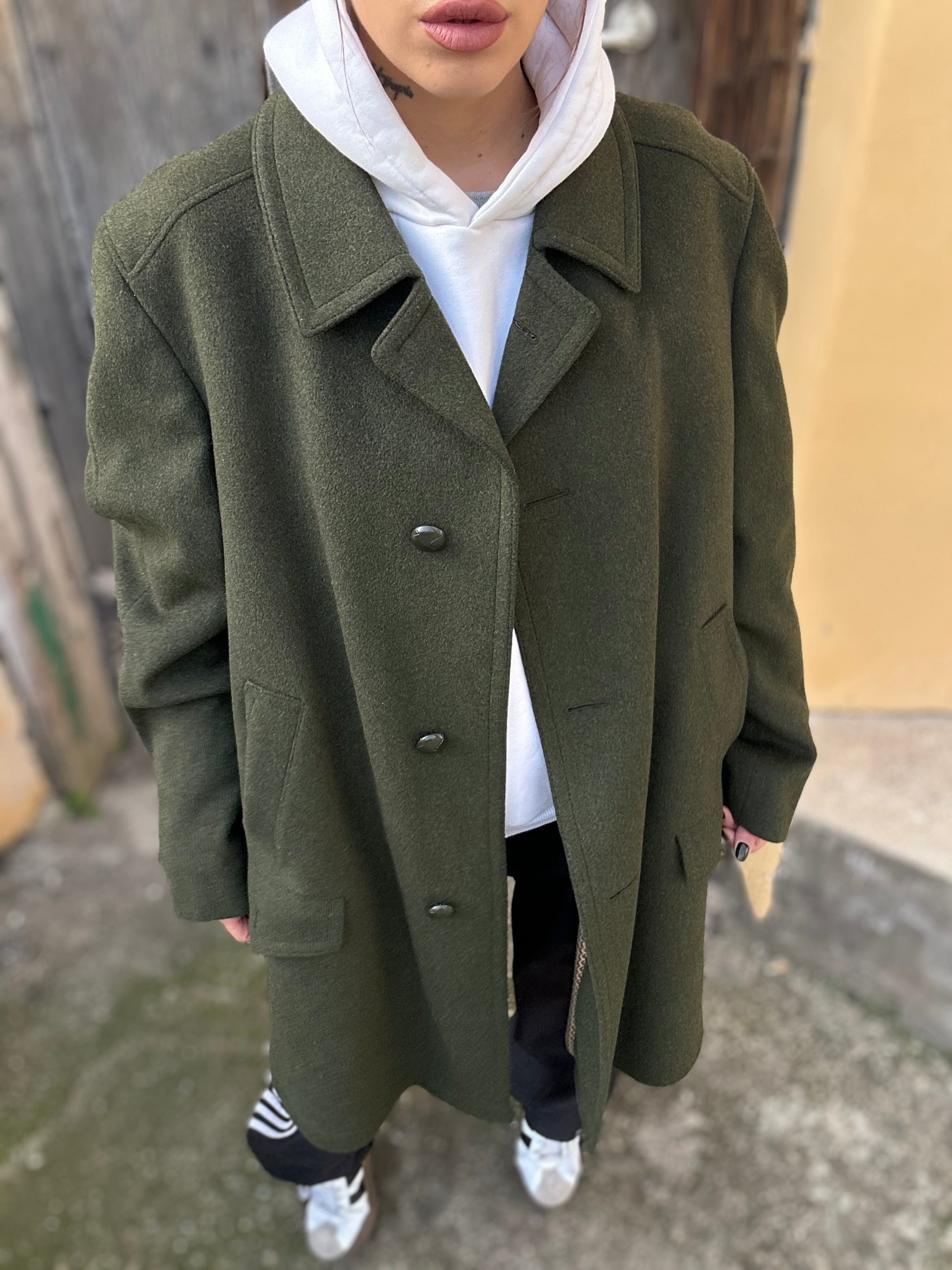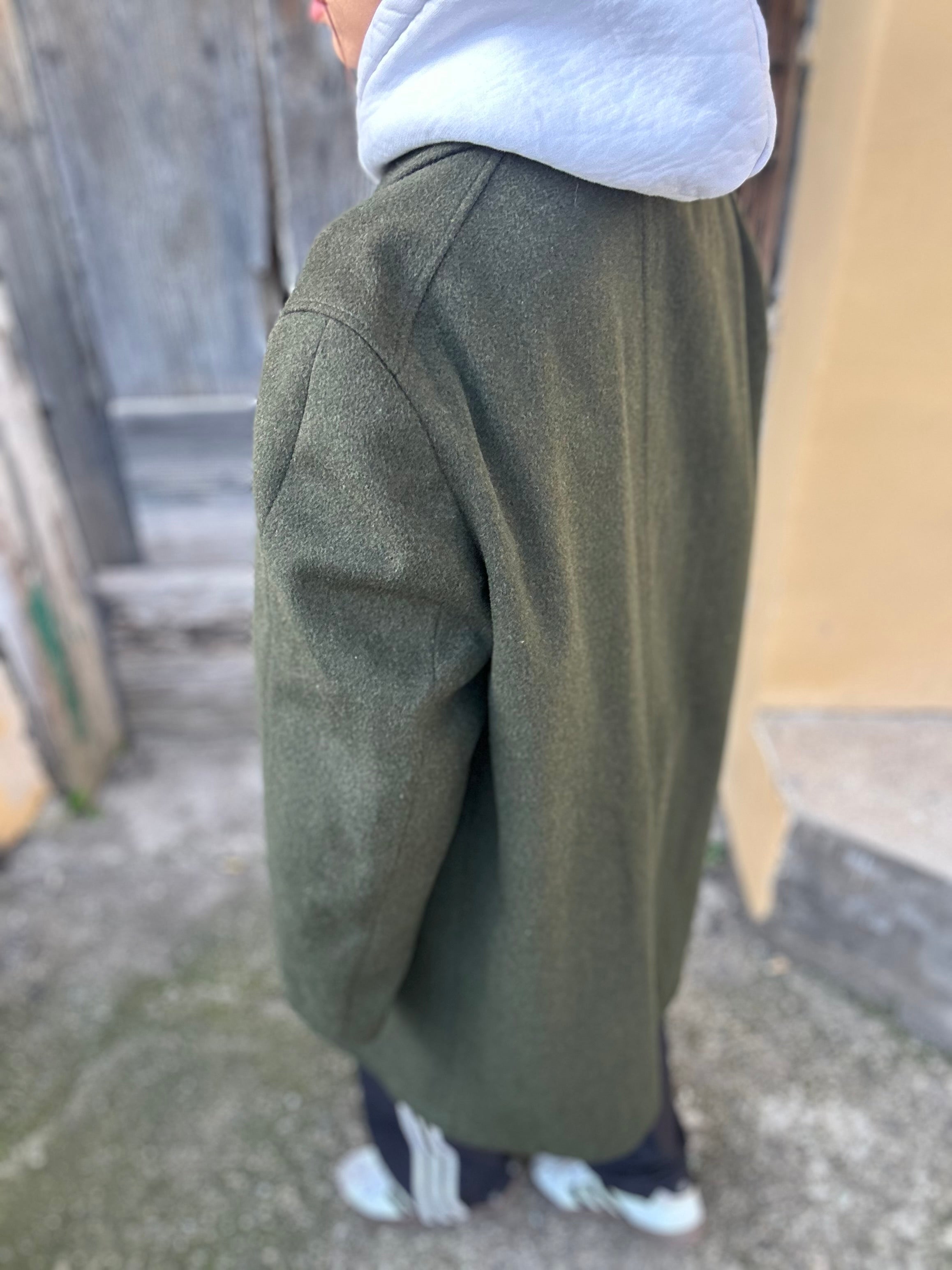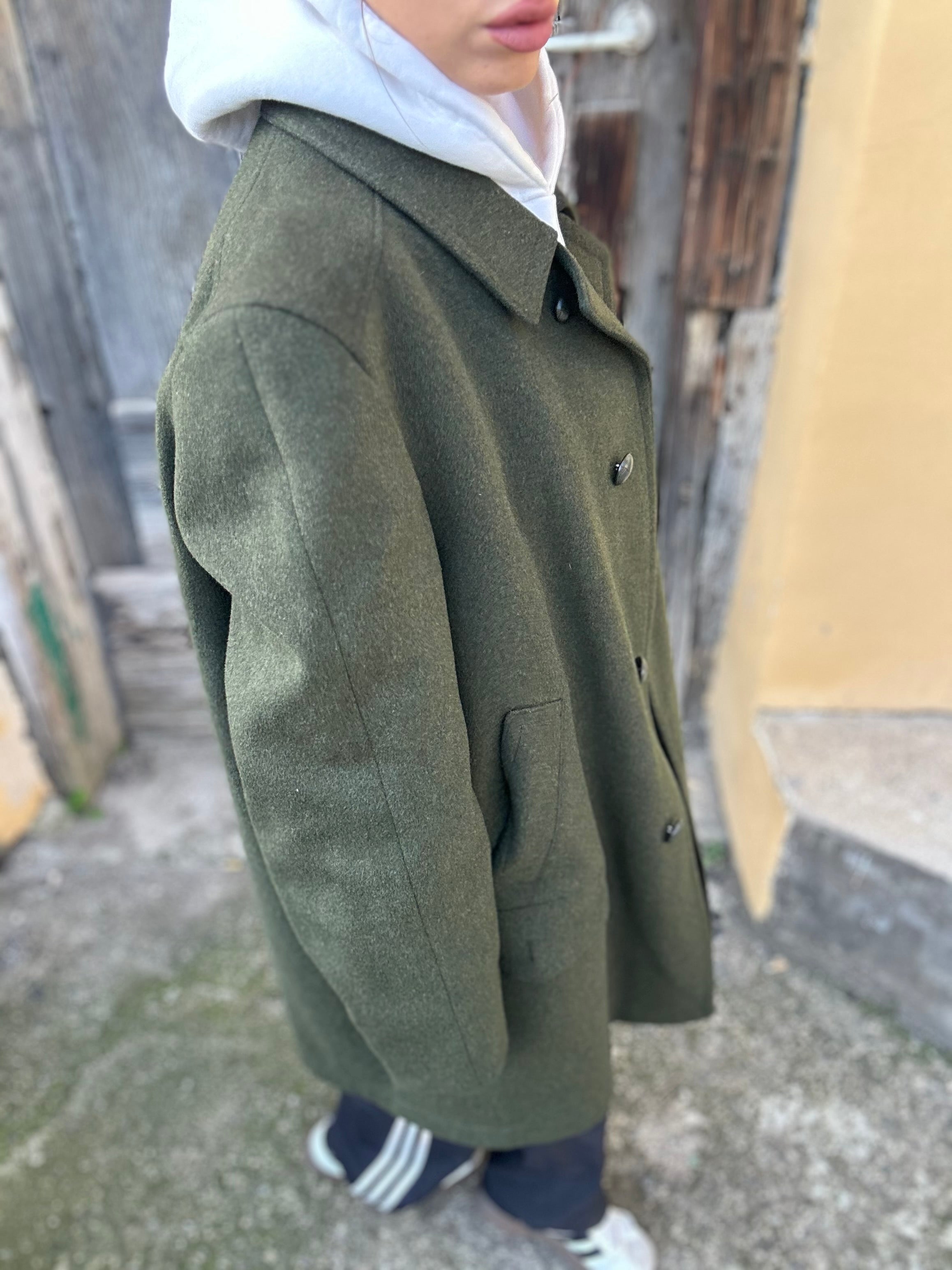 Loden Verde in 90% lana, 10% poliestere taglia 56 Vestibilità donna: 42-44 (44 Over)  Misure capo: Spalla a spalla 50 cm, lunghezza 96cm Altezza modella: 1.65, taglia 42