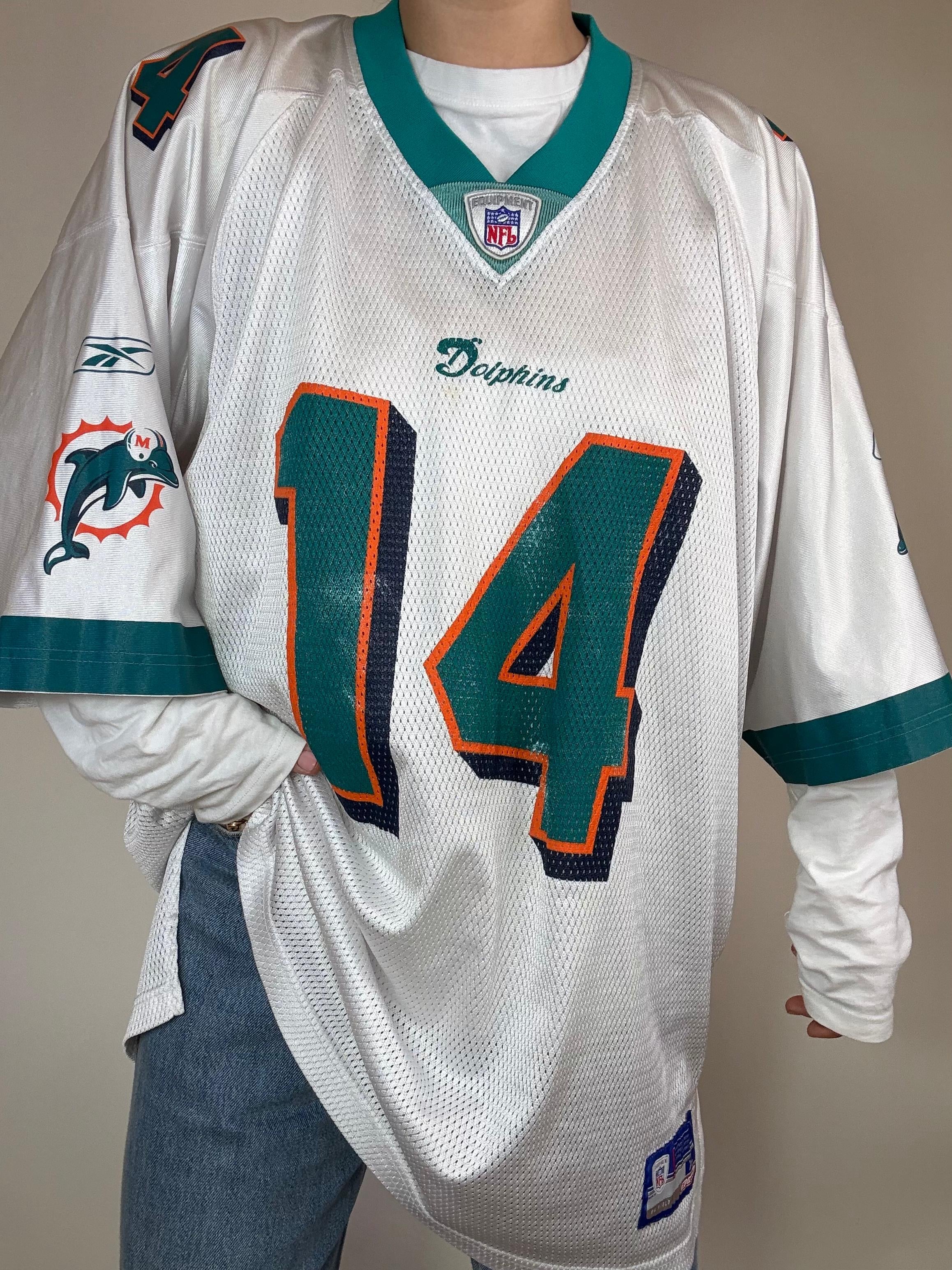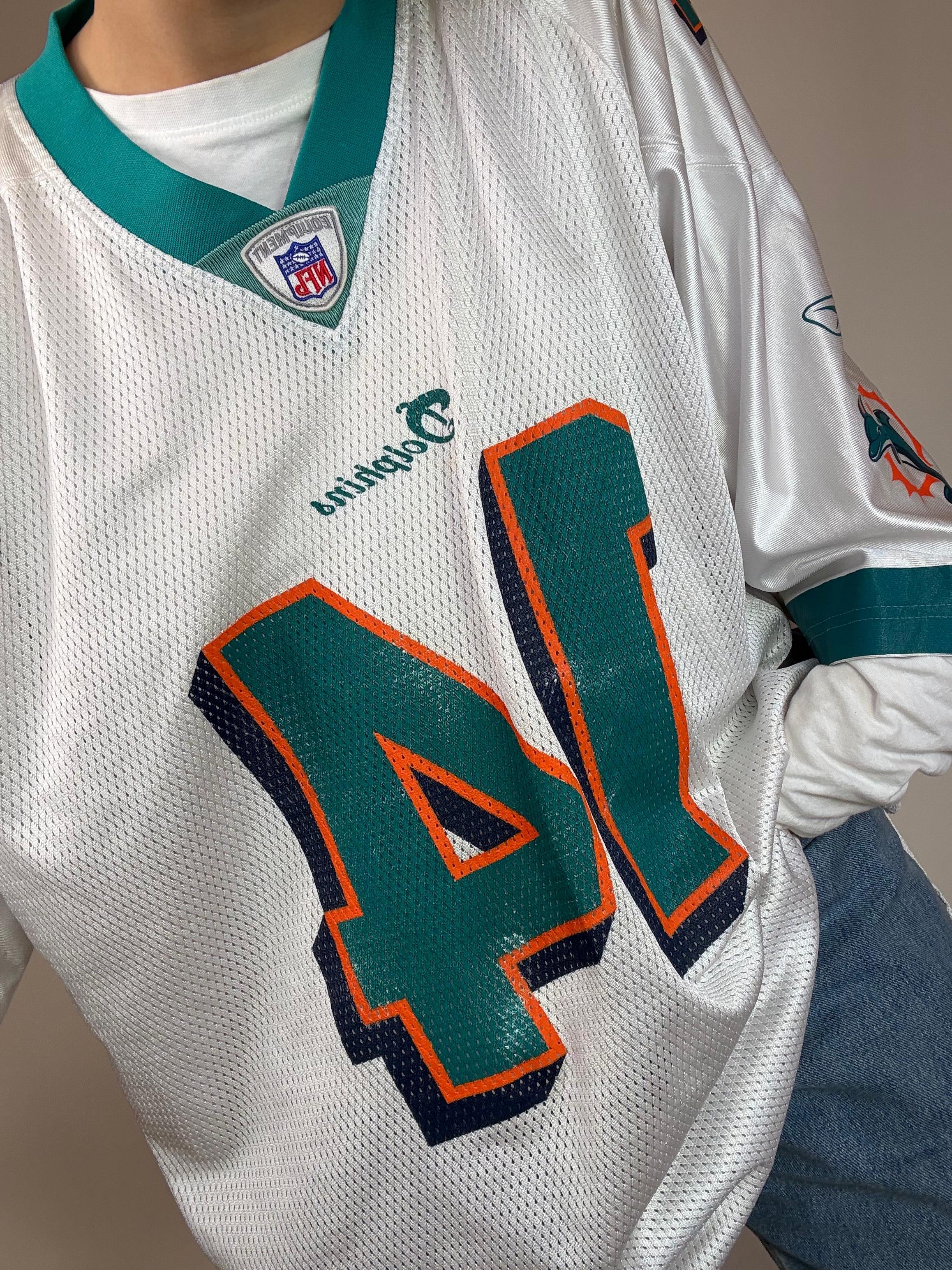 Maglia NFL Dolphin Taglia XL Vestibilità: 44-46 Over Misure capo: Spalla a spalla 60cm, lunghezza 93cm Modella/o: Taglia 42-44, Altezza 1.65
