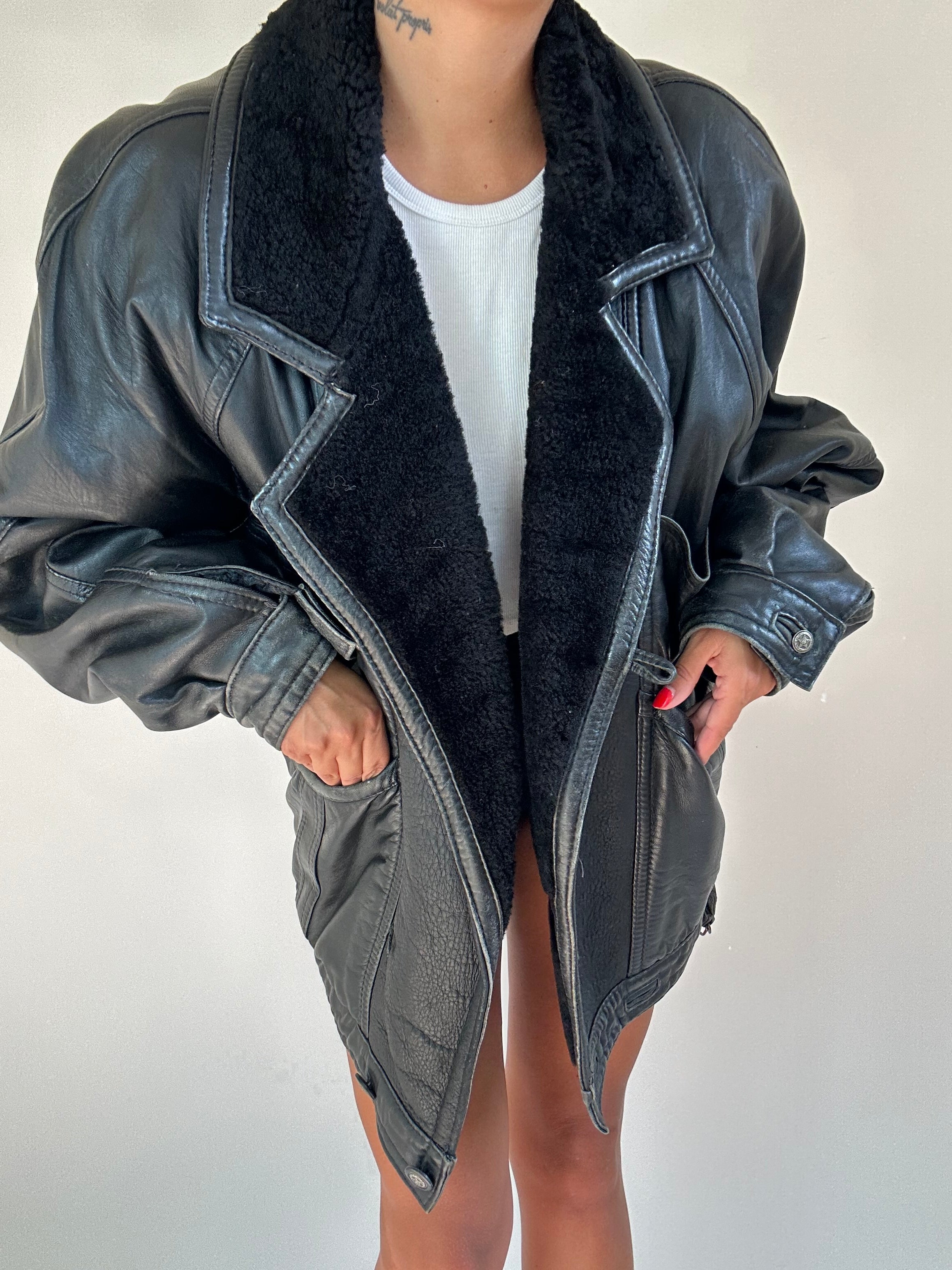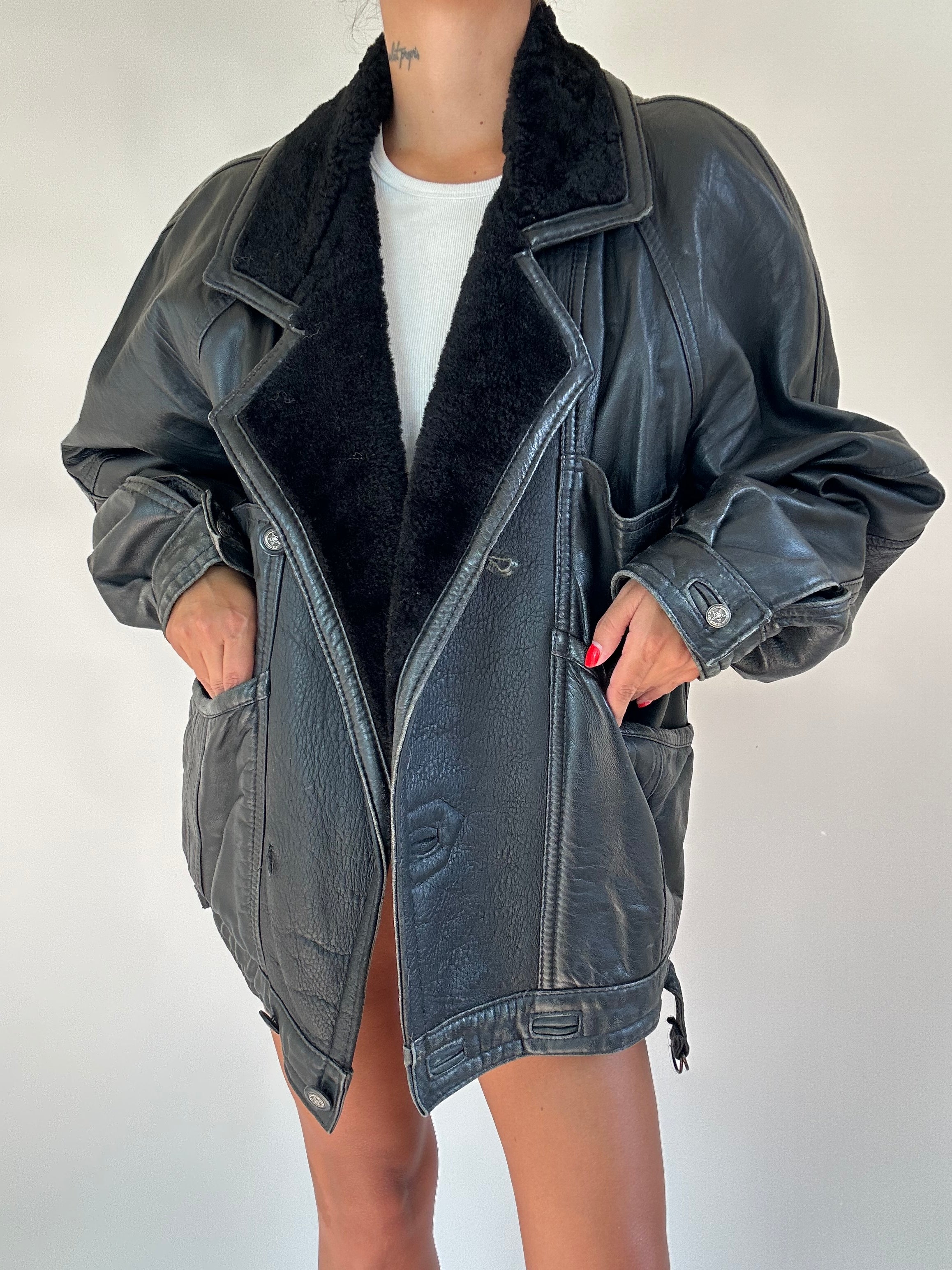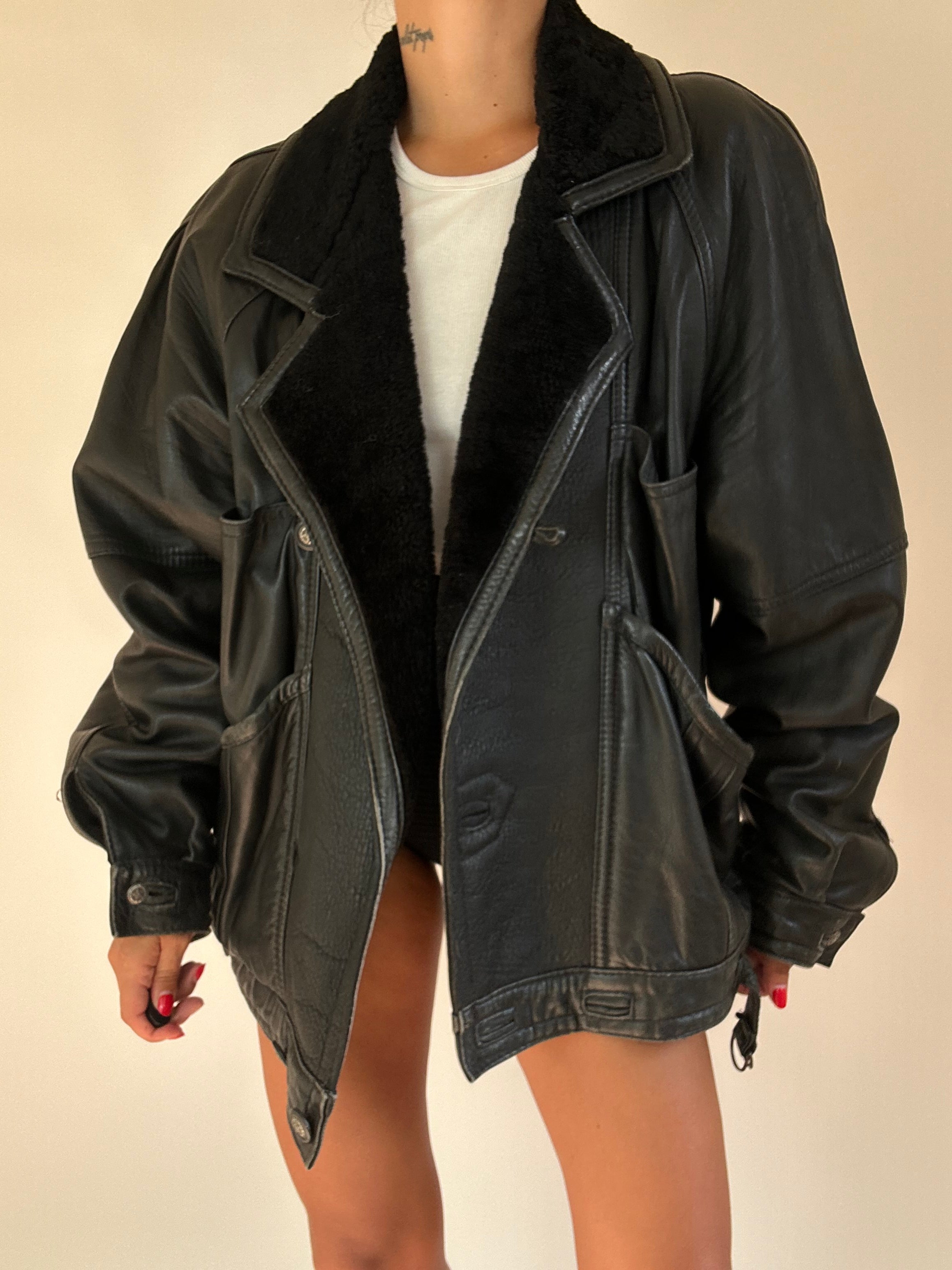Montone nero taglia XL  Spalla a Spalla: 45cm Lunghezza totale: 71cm Taglia Modello\a: 42IT x 1,70 Composizione: Vera Pelle