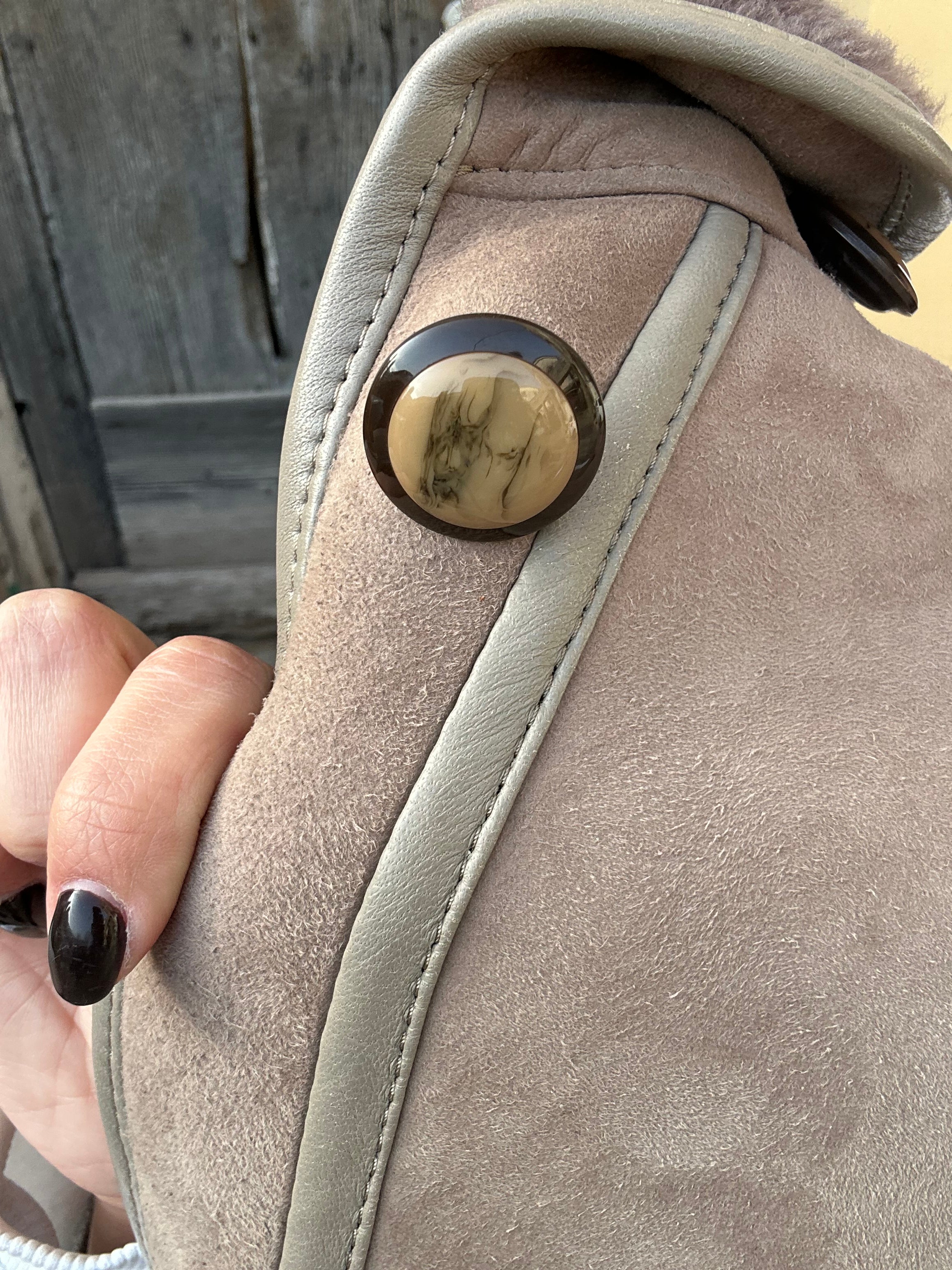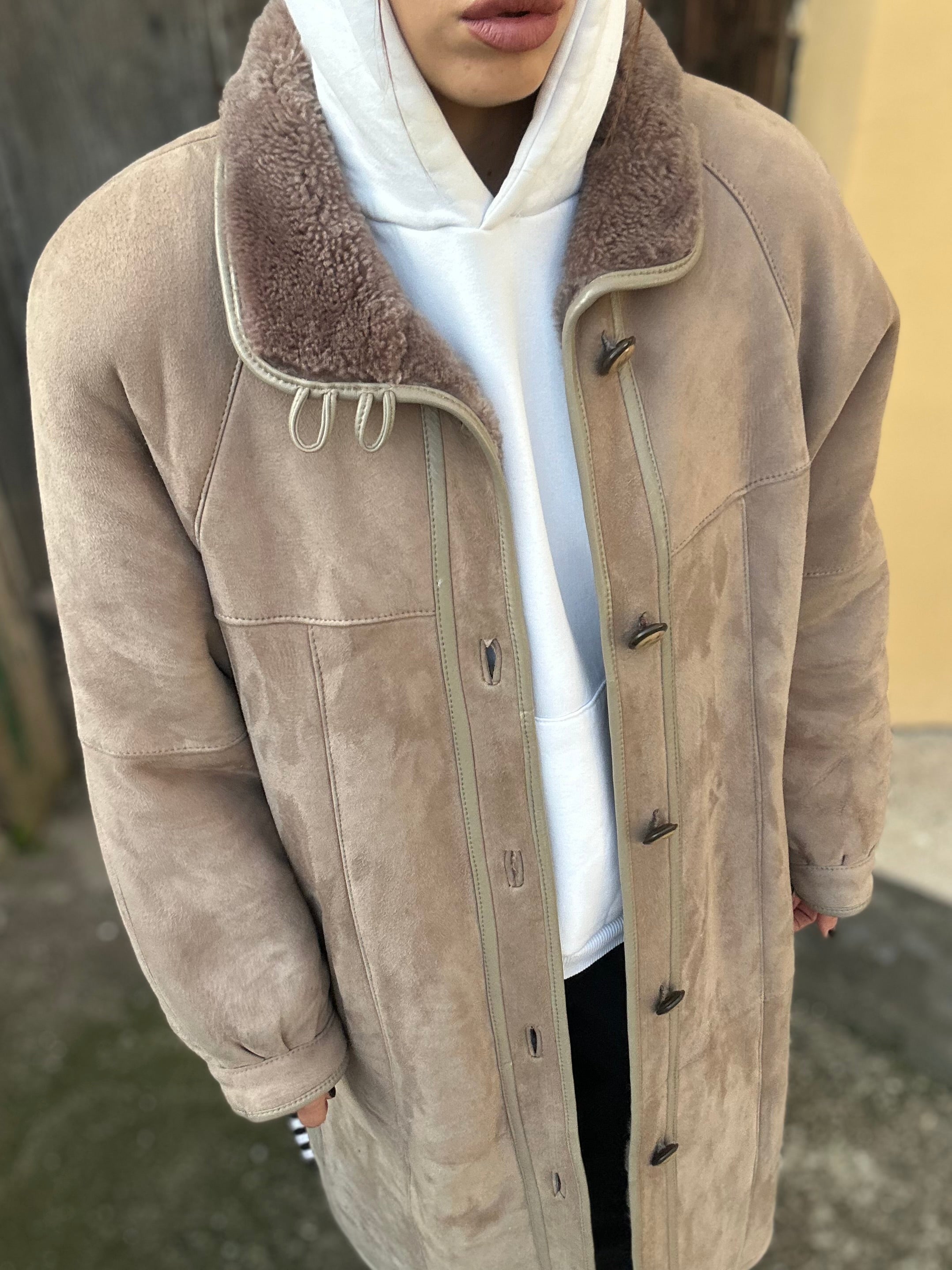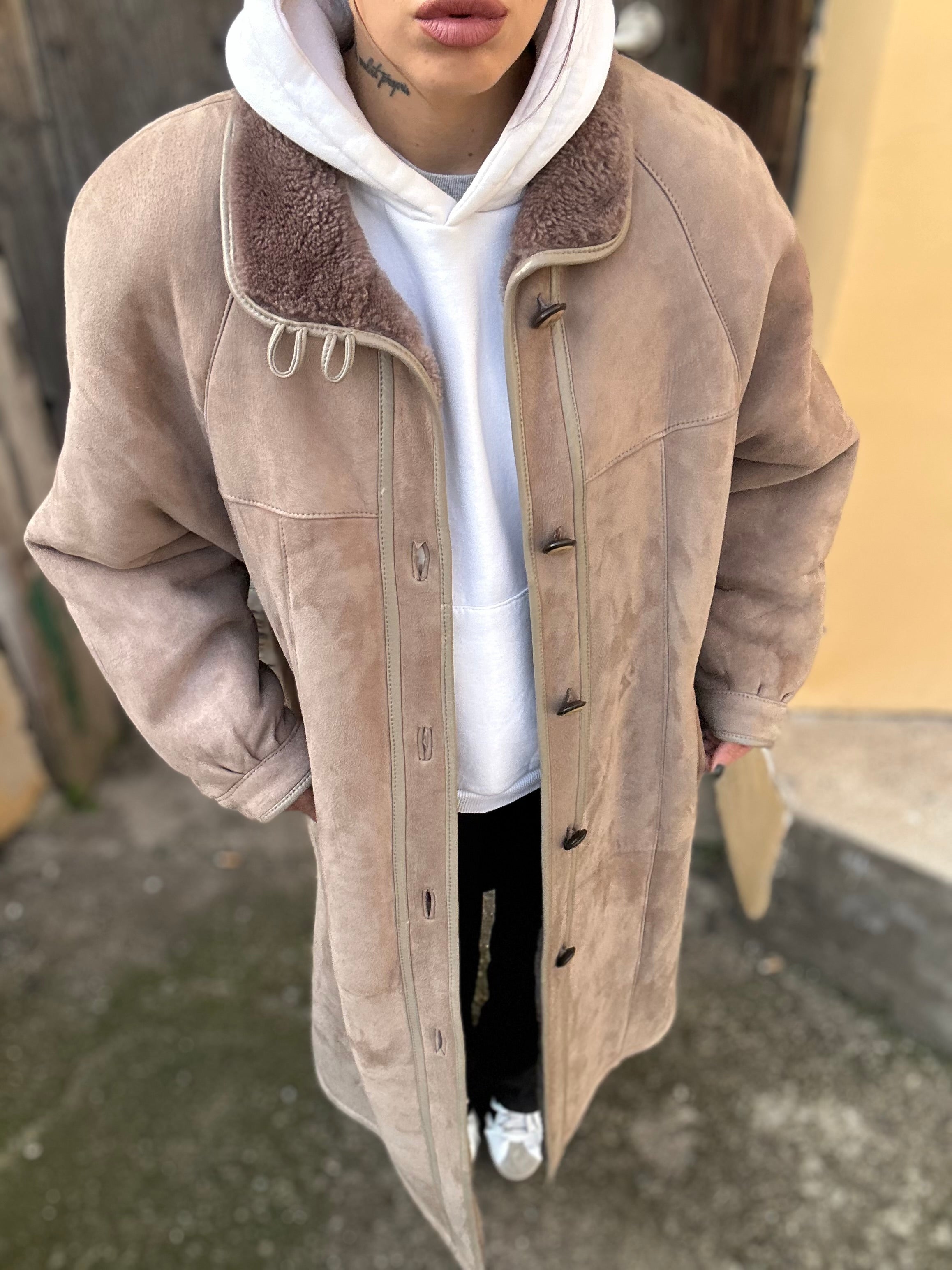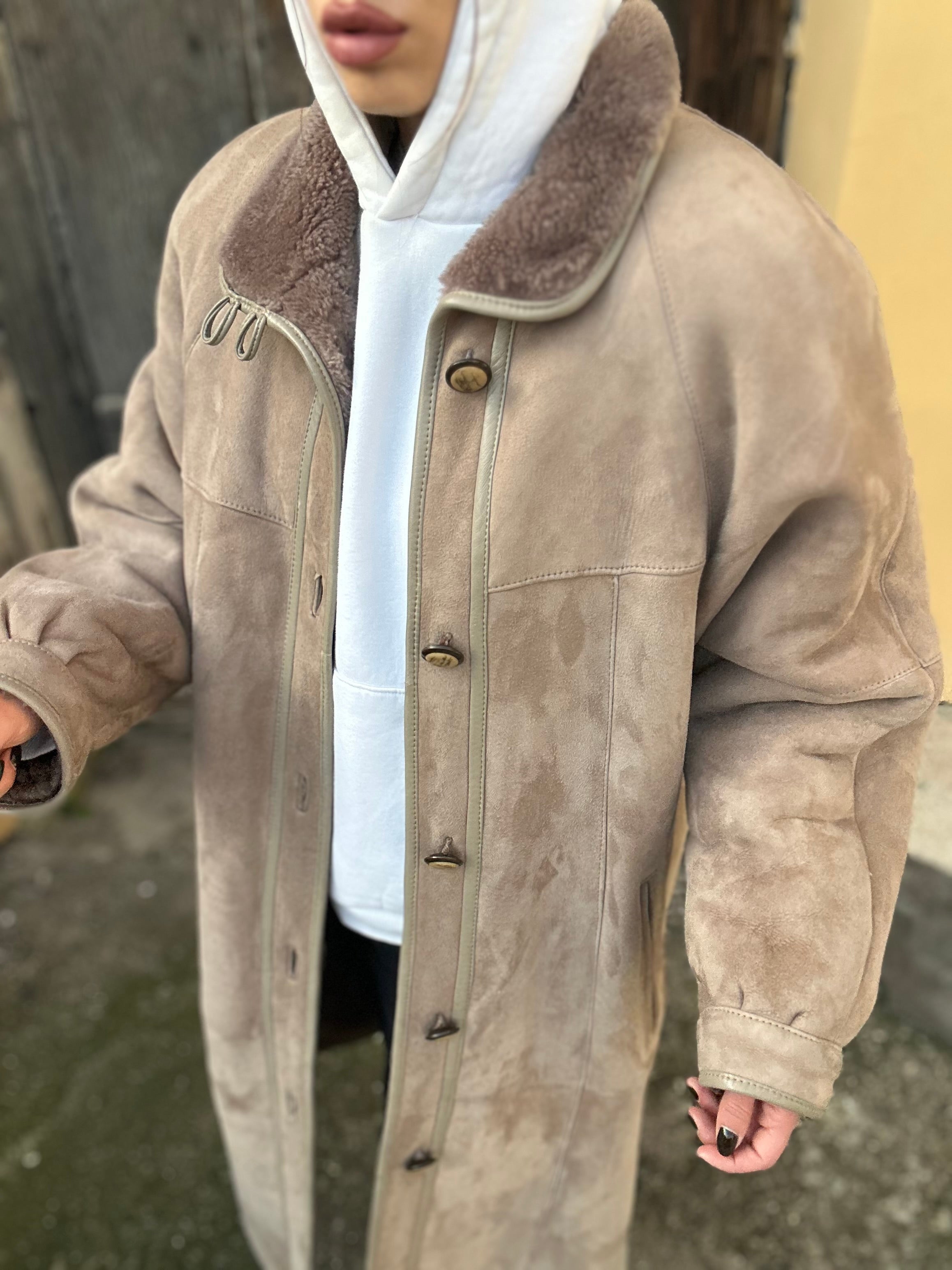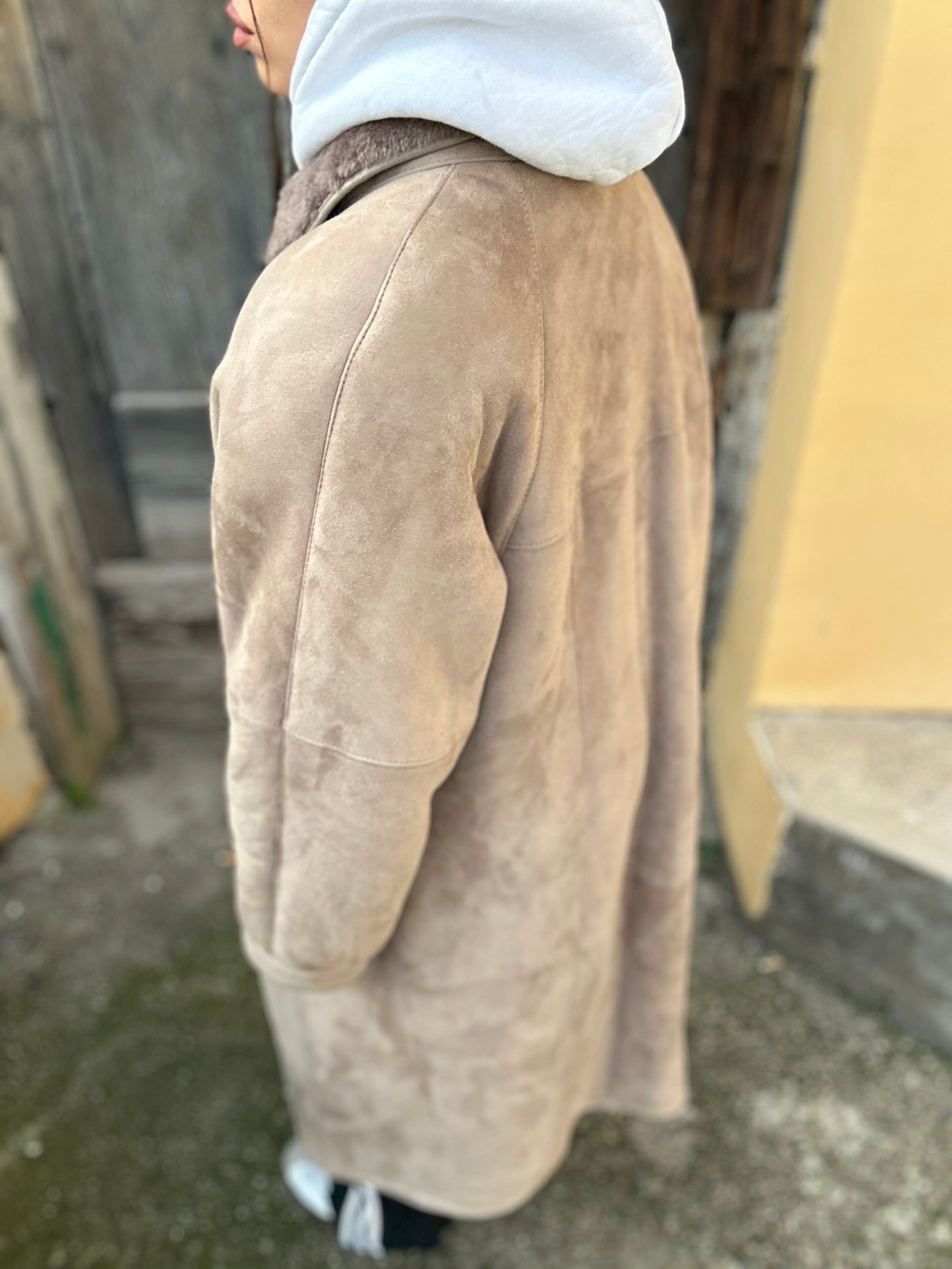 Montone Shearling Grigio Unisex Taglia 46 Vestibilità donna: 40-42(40Over)  Misure capo: Spalla a spalla 50cm, lunghezza 112cm Altezza modella: 1.65, taglia 42
