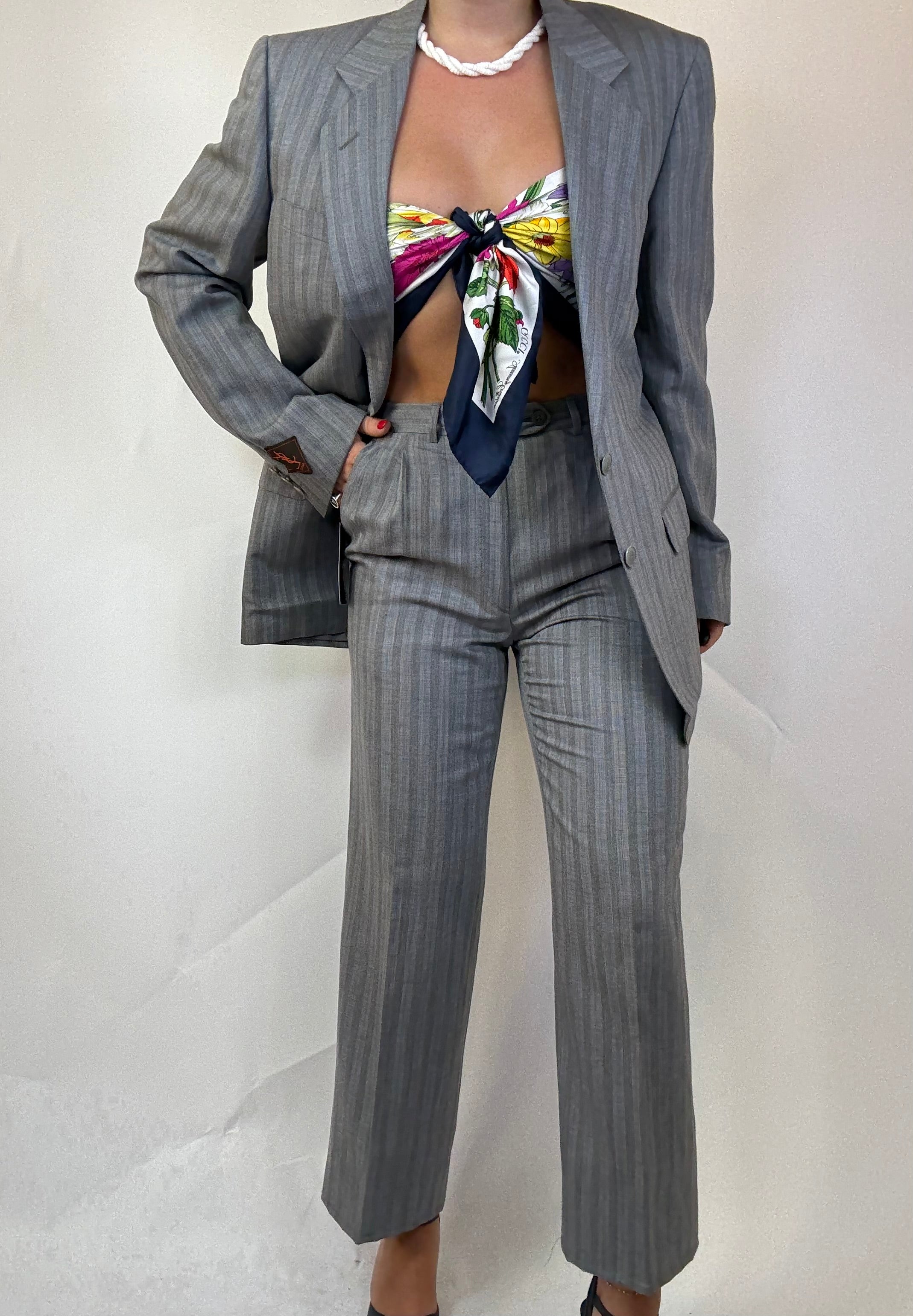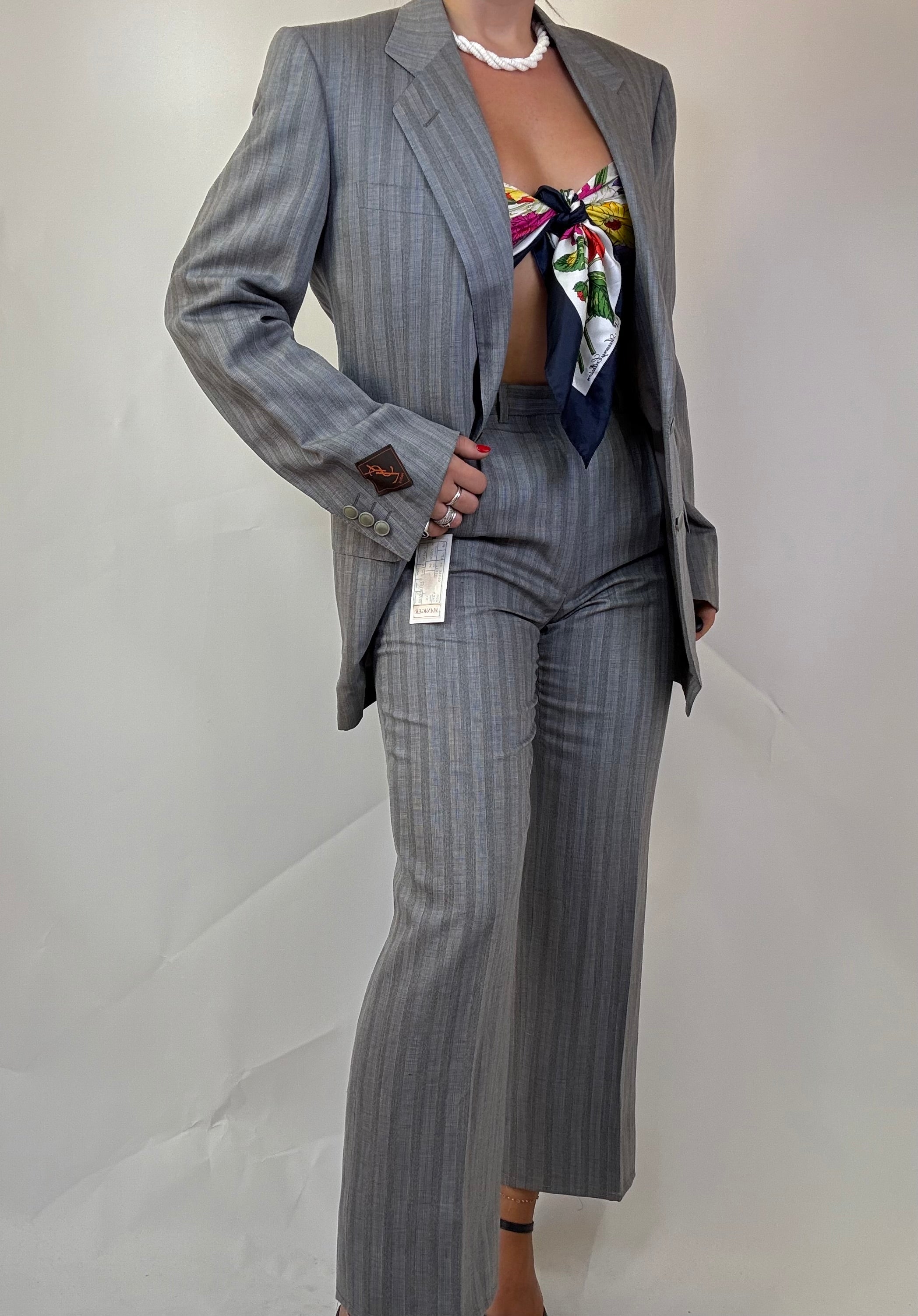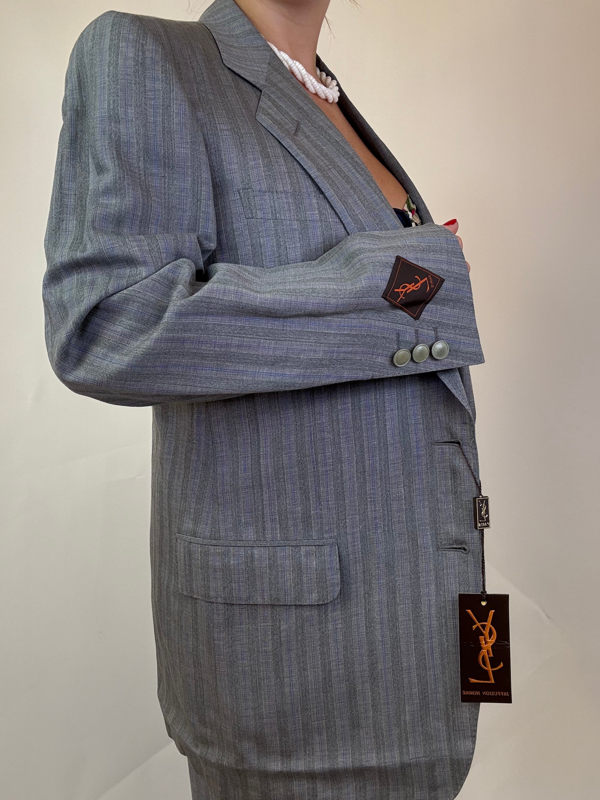 Tailleur Ysl con bottoni logati e dettagli sul polsino in 55% lana e 45% lino, taglia 46, con cartellino e gruccia originale
