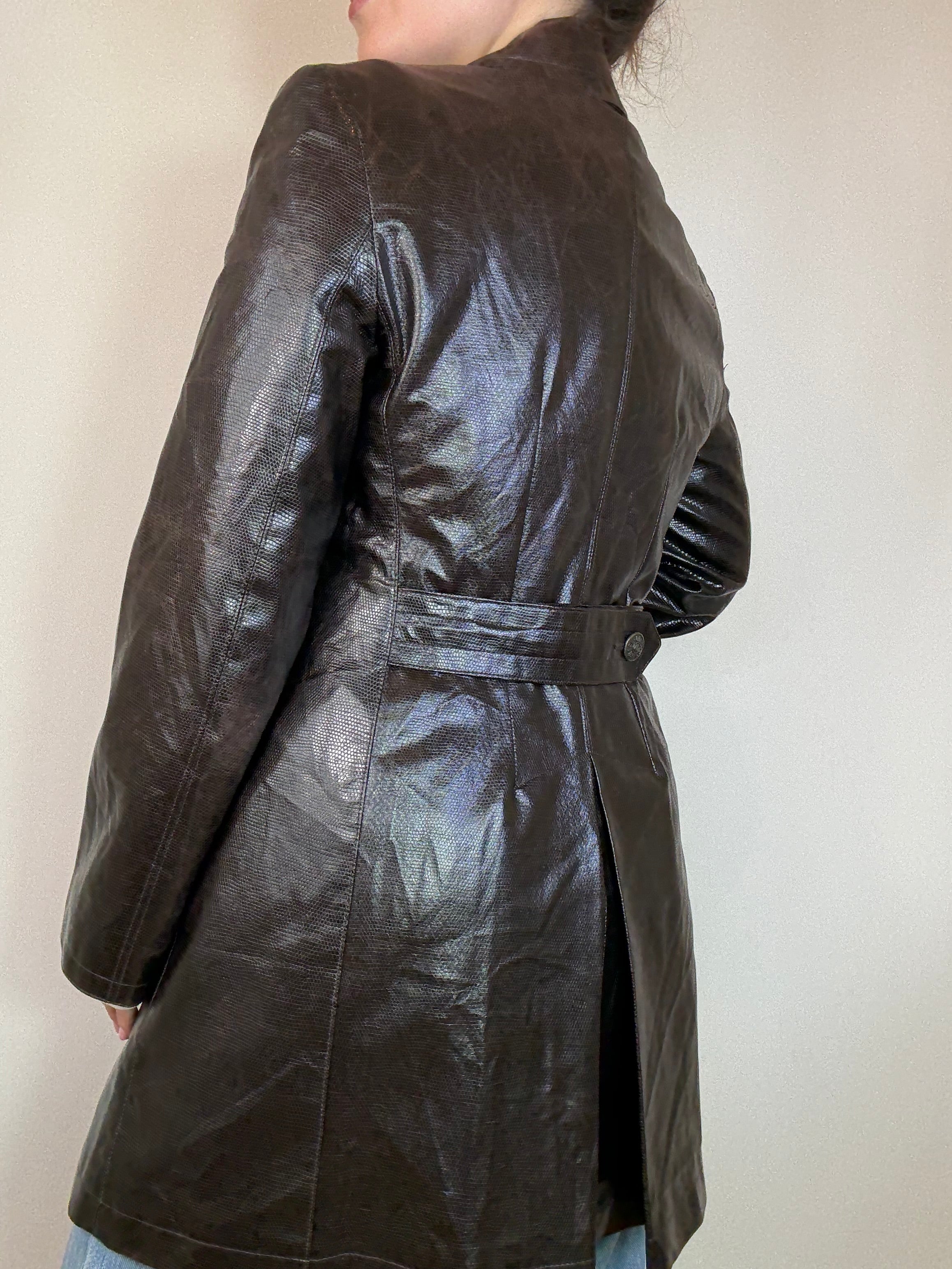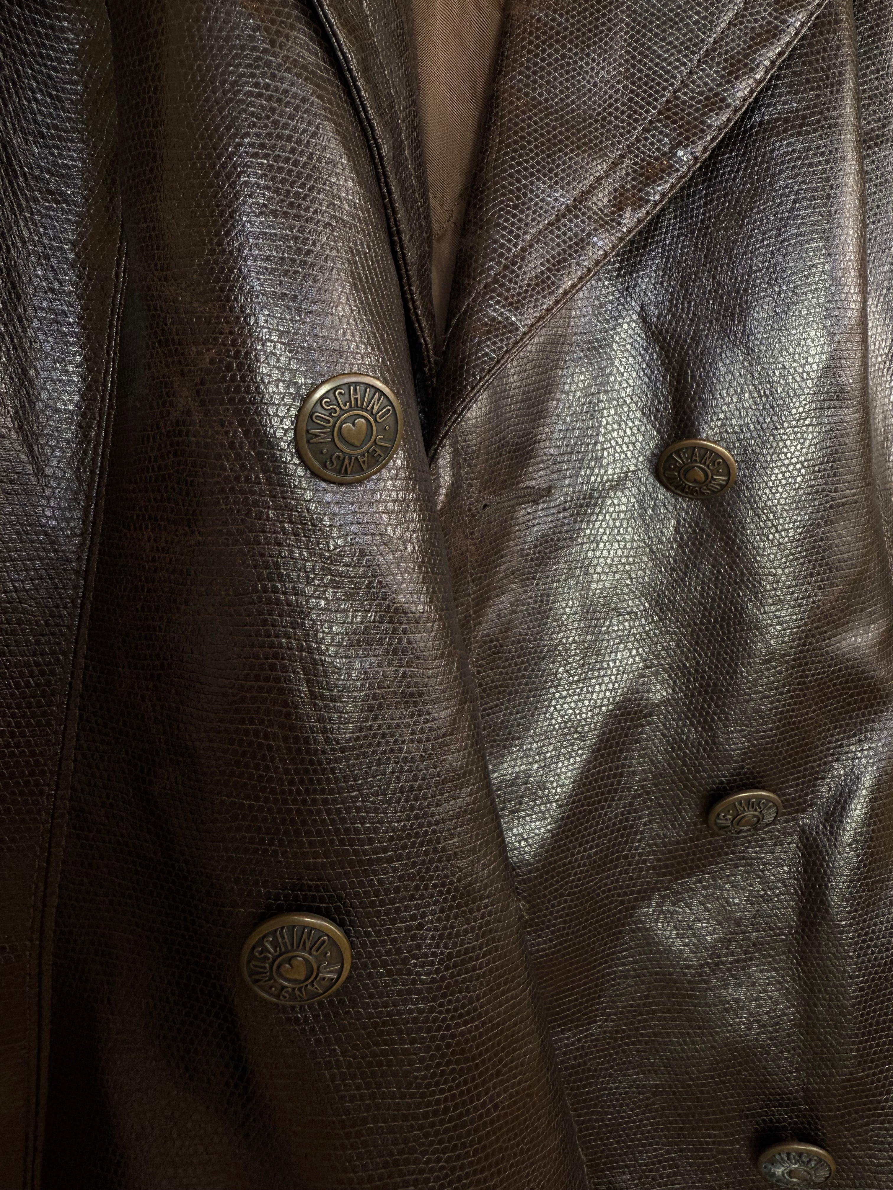 Trench Moschino in Pelle martellata marrone con bottoni logati taglia 46 Vestibilità: 42-44 Misure capo: Spalla a spalla 44cm, lunghezza 85cm Modella/o: Taglia 42-44, Altezza 1.65